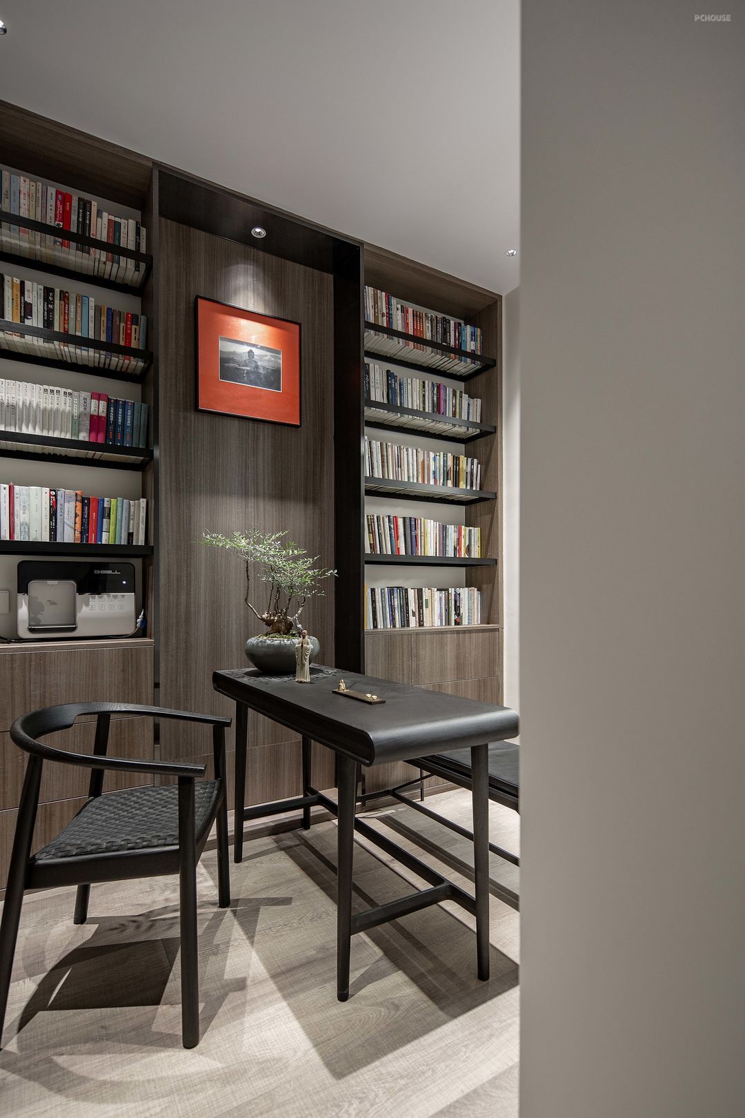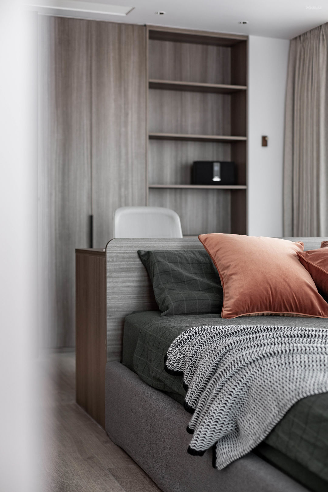 公共空间的墙体都做了饰面装饰,但没有过多的线条造型;家具表达的设计语言也是沉稳的;即使是B&O的音响,只选用了简洁的单色。整体空间是克制的,讲究却不张扬,非常符合陈先生的气质。