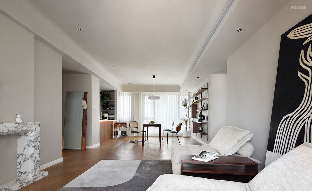 艺术漆保持了空间简素的调性,浅色人字拼地板则带来些许温度。沙发背后的现代艺术画,与都市简约的家居组合碰撞,呼应了屋主向往生活与艺术相互涵养、浸润的精神追求。