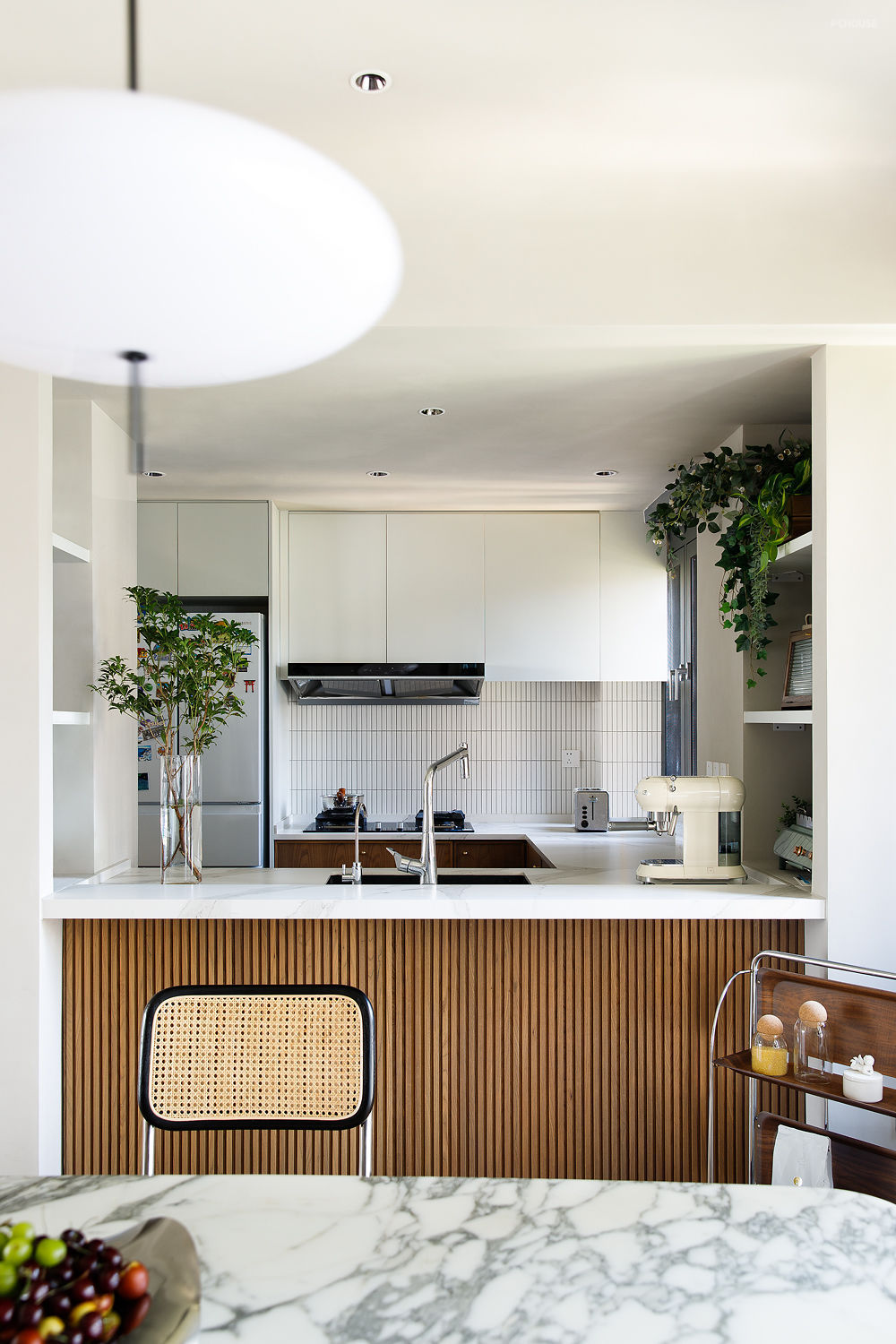 原本封闭的厨房打开后,也解放出了餐厅区域,整个空间的采光豁然开朗,厨房、餐厅、餐边柜、彼此串联,形成自由通达的整体格局。