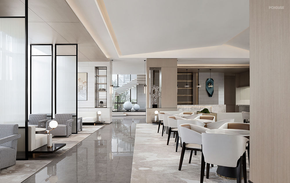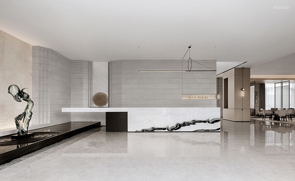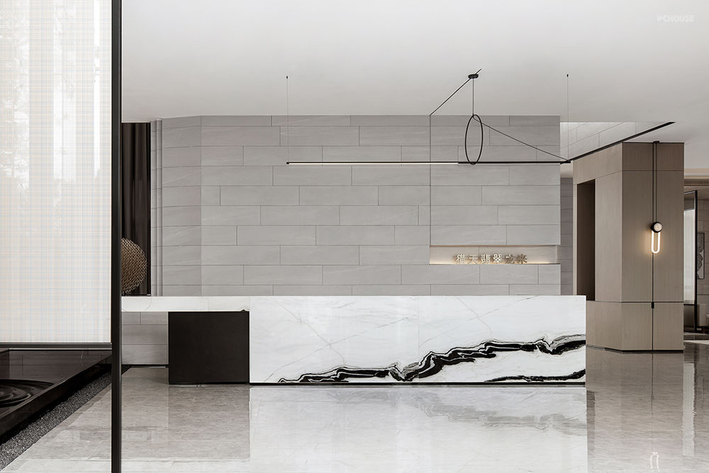 纯粹的空间,泛着淡淡的雅致,石材以干净利落的切角分面,透出现代的块面设计手法。墨绿色的金属挂饰,个性而时尚,彰显空间的高级艺术感。大块面的错落斜顶天花将不平衡动态观感极致呈现, 以现代方式重构传统秩序美, 光线提炼天花块面轮廓,将传统的意向表现得深入细腻。