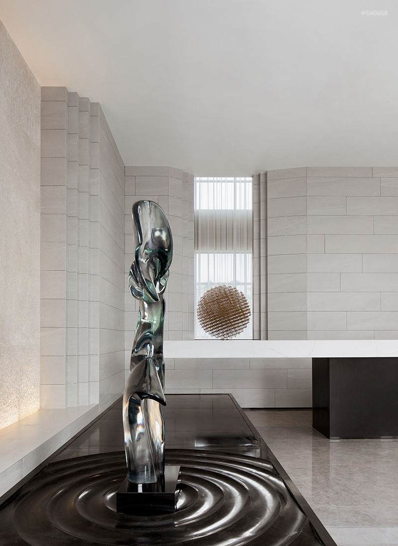 石材的天然质地,渲染出空间不加修饰自然美感,飘逸的墨迹以当代艺术手法绘制出水波的形态,起伏涟漪。玻璃艺术雕塑将曲折有机形态与空间几何肌理糅合,通透的材质变幻着空间感知色彩,如同水底踊跃而出的鱼儿泛起层层涟漪。木榫结构纵横交错,于虚实间构建出朦胧月影。