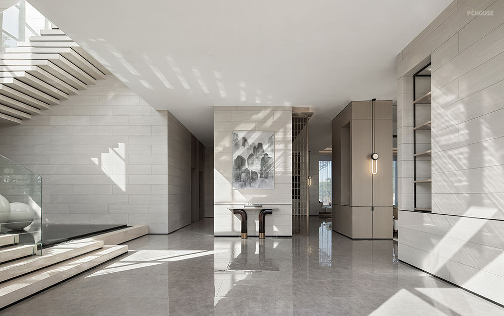 本案由深圳太合南方设计主笔,延续广西优美的地理环境和人文精神,在现代主义的设计构架之下,融入东方意境,切入诗意的观游,以水、月、石、光的解构空间信息,构筑趣致的空间形制,经由不同的自然肌理材质铺排,搭建起传统与现代的艺术桥梁。