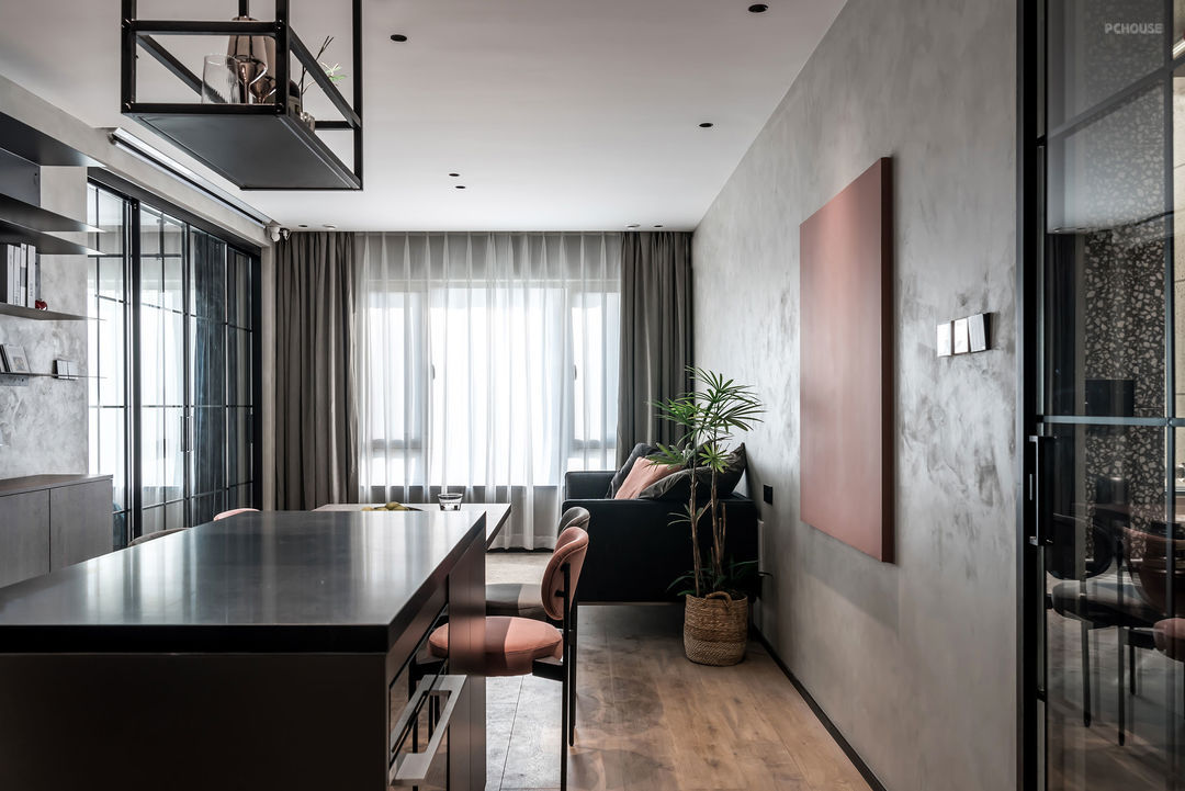 进入这个家的视角,原本一览无余的客厅格局被改造,增设一组独立岛台和餐边柜,通过对整体空间暗色调的渲染,明暗与材质的呼应,帮屋主规划了全新的生活体验。