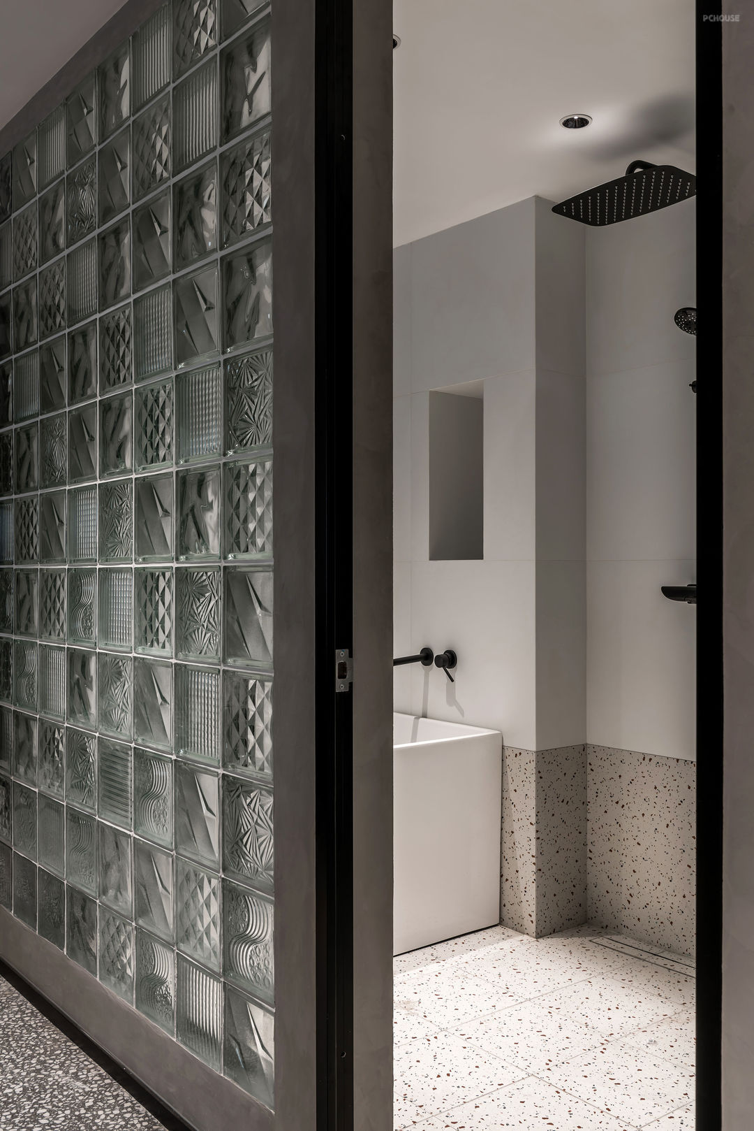 改变原本的暗卫空间条件,浴室湿区采用玻璃砖创造空间分区,既不拒绝光线,又隔离了水汽,增加空间透光性。一个纯净、通透的浴室。
