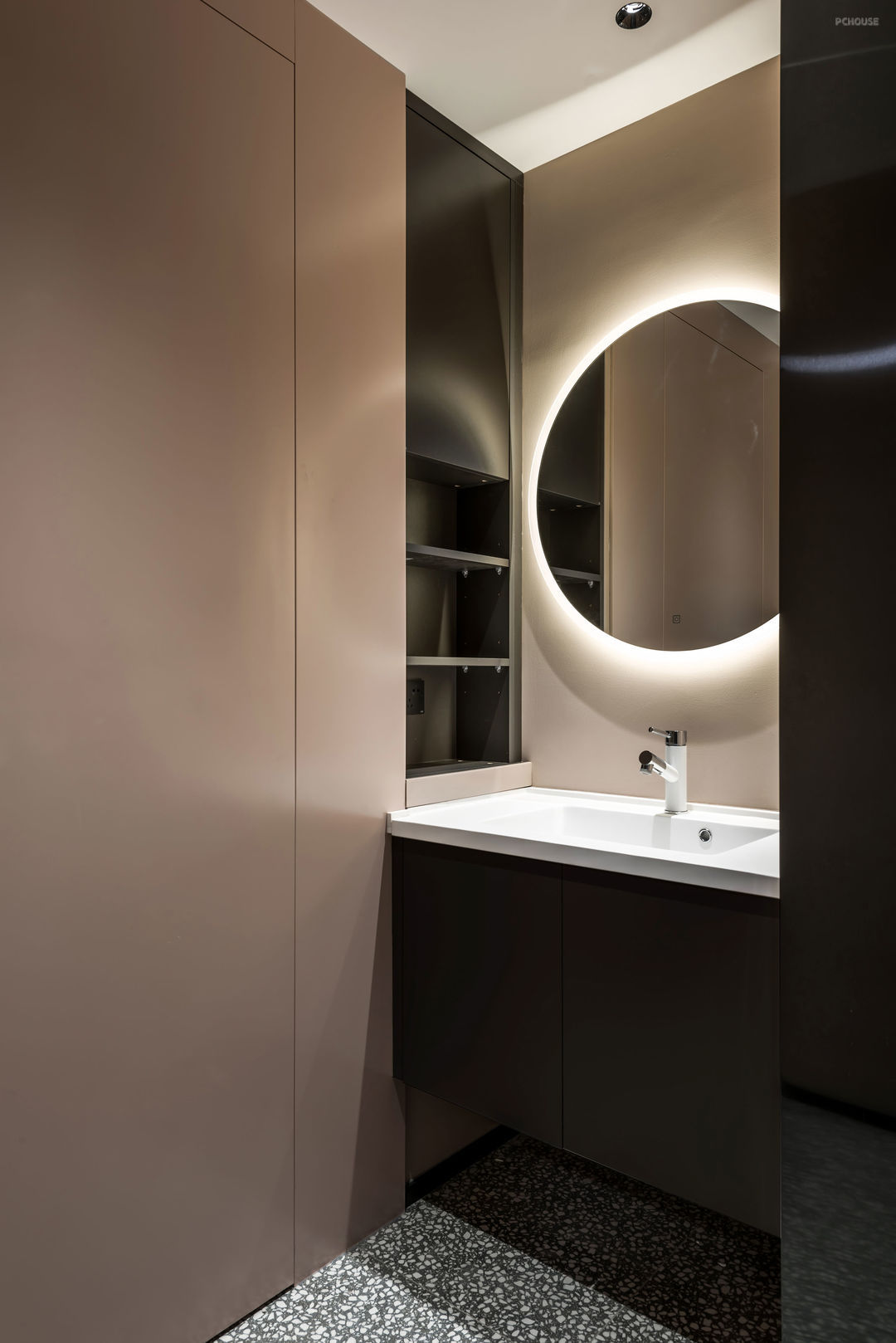 随意切换的隐形门,外置洗手台的设计方便了日常洗漱,灰粉与纯黑是温柔和冷冽的碰撞,两个截然不同的代表词交叠,让空间拥有独特的视觉感受。