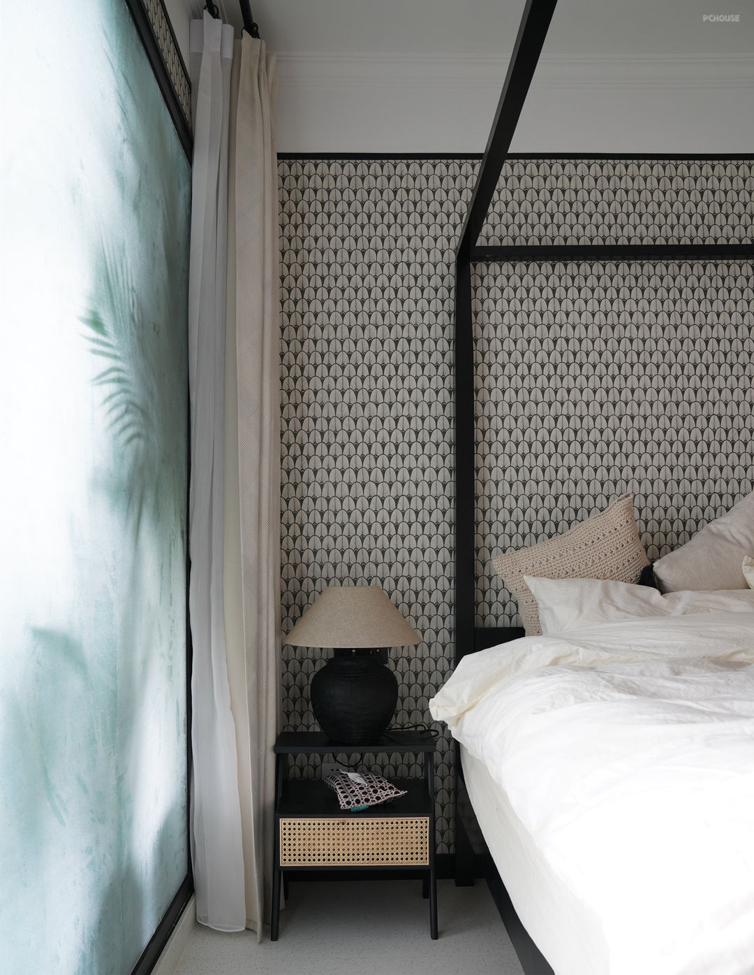 利用南向自然光形成的树影,变成卧室最浪漫的装饰,引入了采光,照顾了隐私、同时消解了原本卧室的封闭感,将阳台的功能纳入到主卧的动线和场景中。不但更好的解决了小户型相对单一的功能动线,提高业主的生活品质。