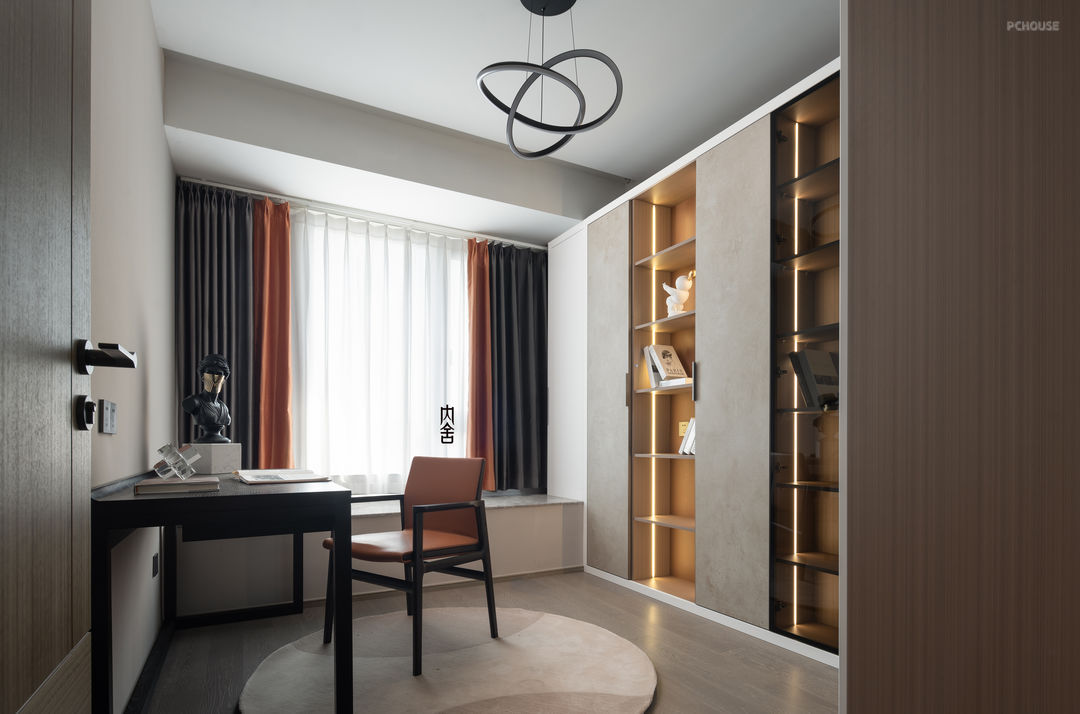 书房整体化繁为简,靠墙做立柜,衣柜做折叠门设计,可以更方便的使用内部空间。书柜区域为透明柜门+内置灯,简约美观