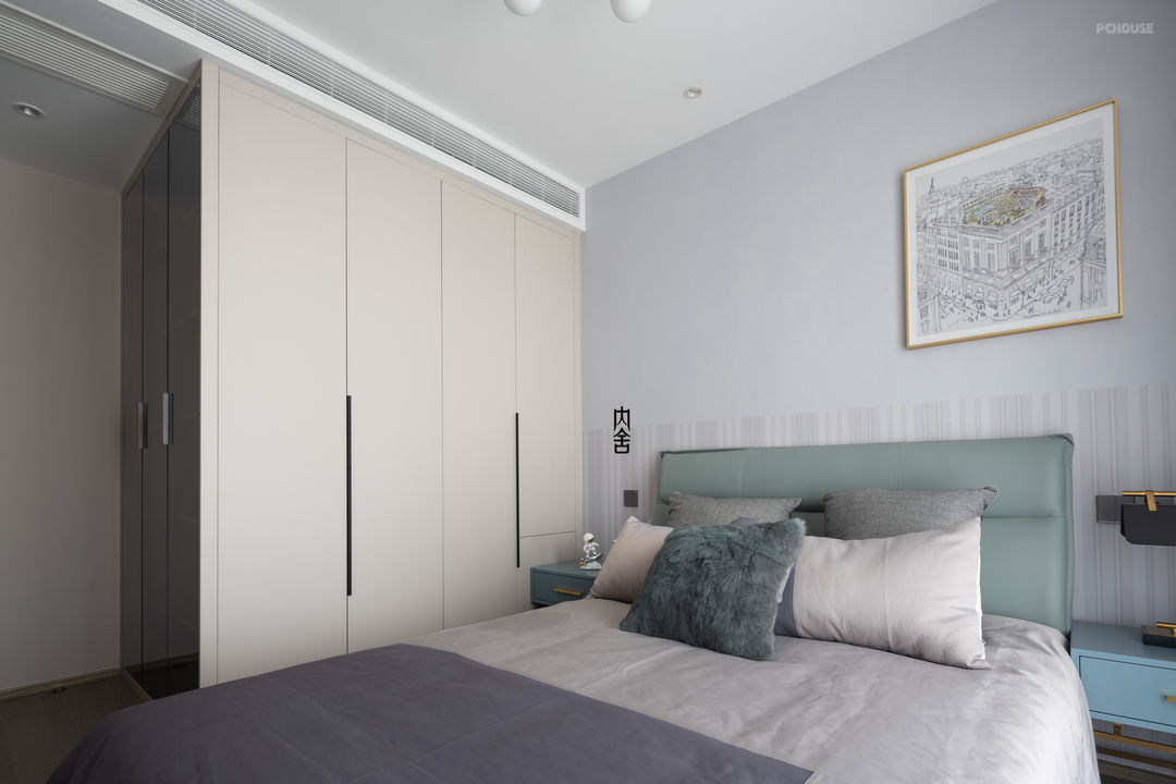 儿子房根据居住者的喜好,融入的灰色+蓝色的搭配设计,整体保留了儿童房的童趣感,也融入了灰调带来的成熟感。对门的定制柜选用了玻璃柜门的样式,满足居住者放置乐高的展示区。