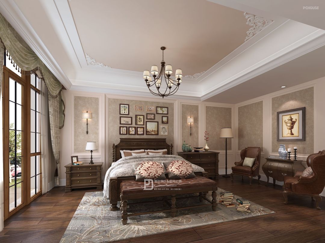 大面的落地窗为室内提供了充足的光线,床边摆放着两张舒适的扶手单椅,让人想象到睡前晚读的美好画面。