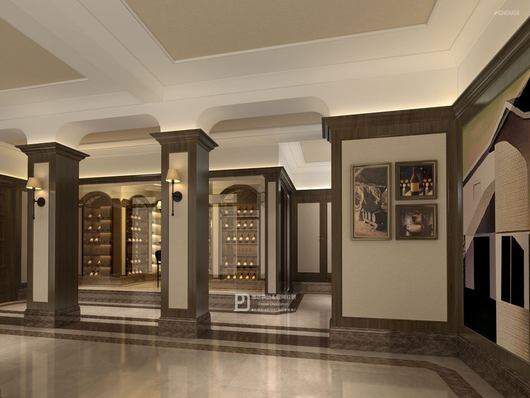 超大的恒温酒柜,复古的拱门扩展了空间的视觉效果,两个区域采用大理石与原木材质混合搭配,实现了冷与暖的双重观感。