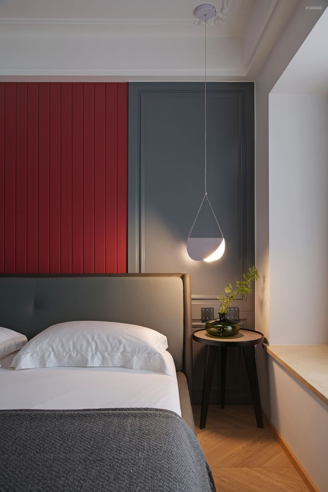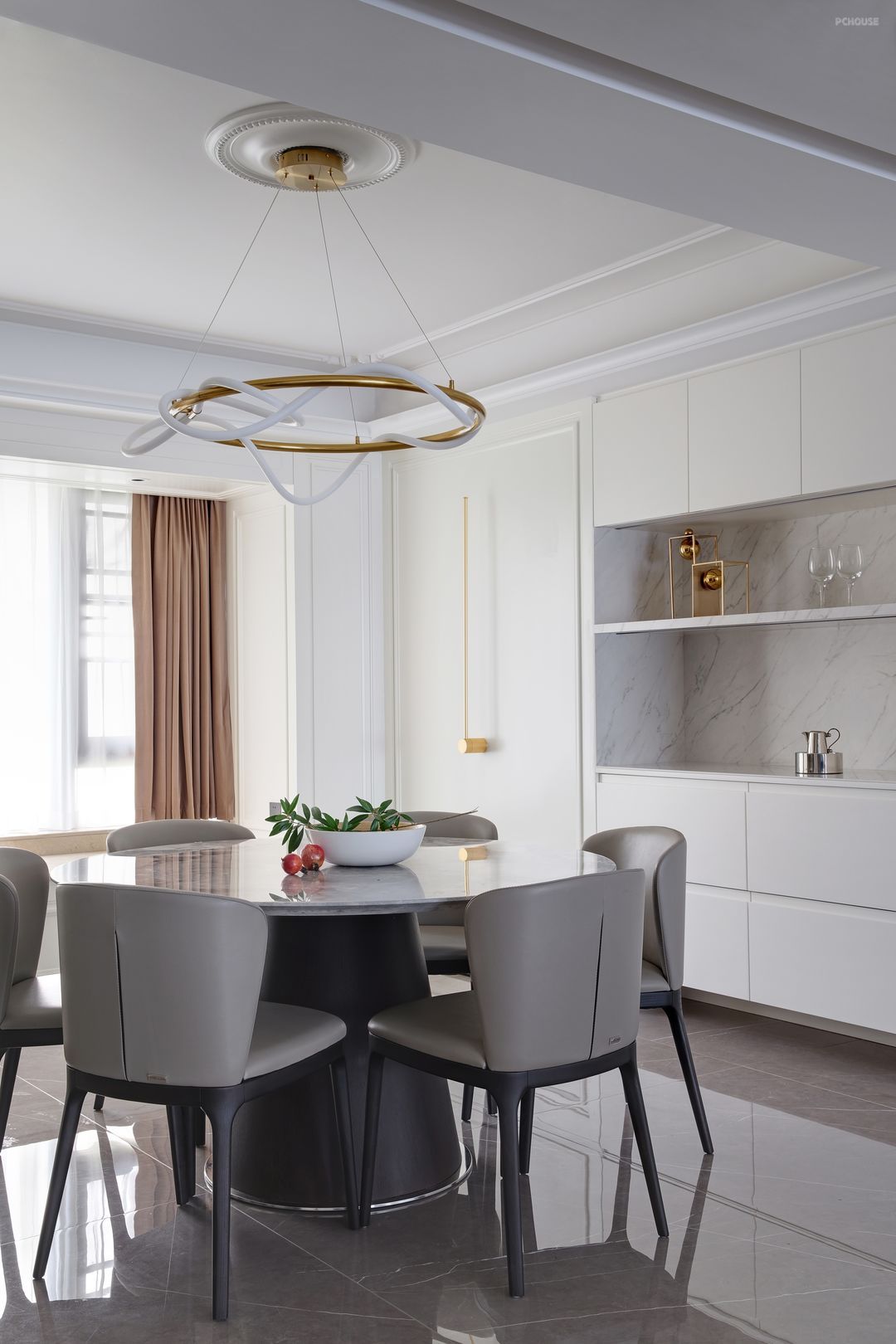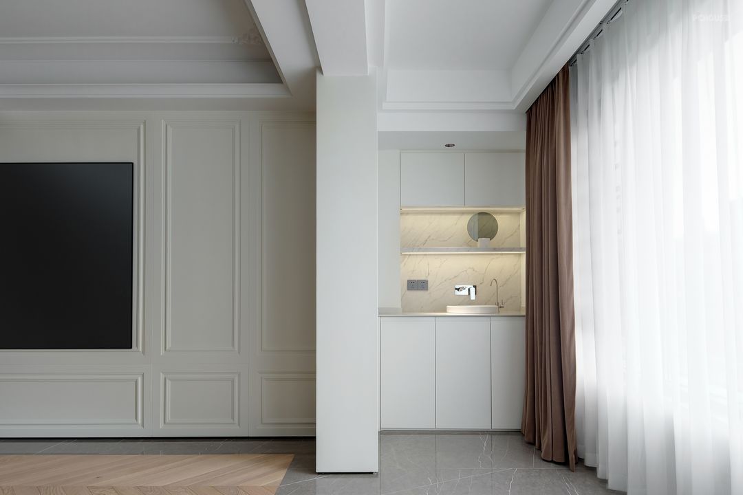 白色的烤漆护墙板,深色的瓷砖,岩板的花纹,鱼缸拼的木地板,在色彩的对撞中带出简洁干净的质感。定制的吊顶PU线条,温润的木皮,及点缀的蓝色烤漆饰面板,浑然一体。客厅南侧高大的落地窗让阳光无拘无束的倾泻进来,柔软的沙发和棱角分明的茶几便可以待客叙旧,又能与家人共享天伦。
