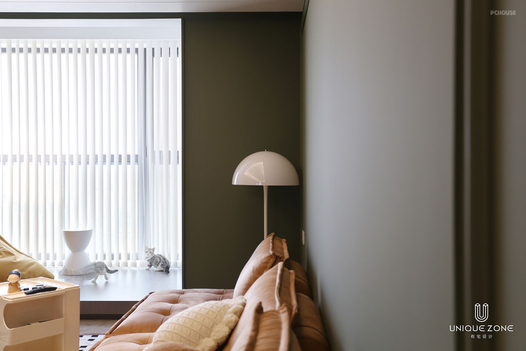 由于部分木色柜体需要保留,于是我们将女屋主喜爱的绿色进行大面积铺陈,营造大空间的基调。定制的棕色沙发让空间点亮,块状形体让空间显得自由不古板。
