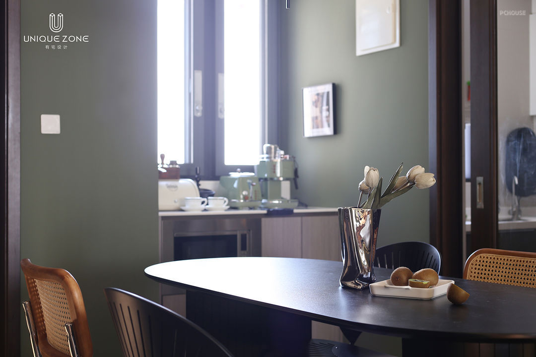 餐厅和入户区,保留了原始的柜子,鞋柜旁墙面增加了整面镜子,方便屋主每日出门前进行仪容整理,也让空间更有通透性。
