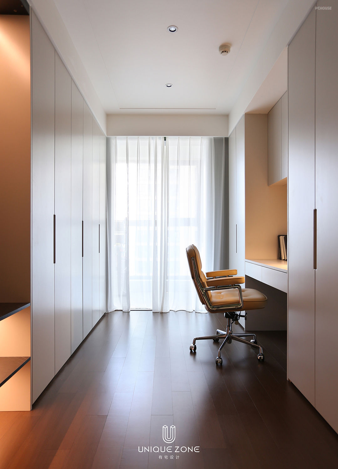 衣帽间在房间的两边做了两排衣柜,还另加了书桌,以方便屋主在家工作时使用,关闭门窗,这里就是一个宁静的居心地。