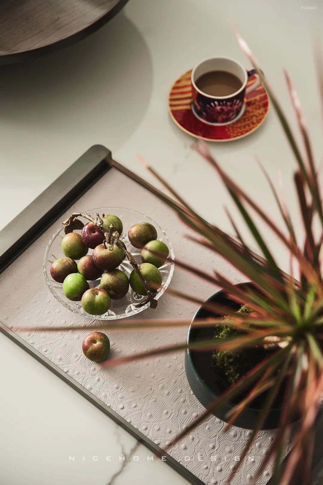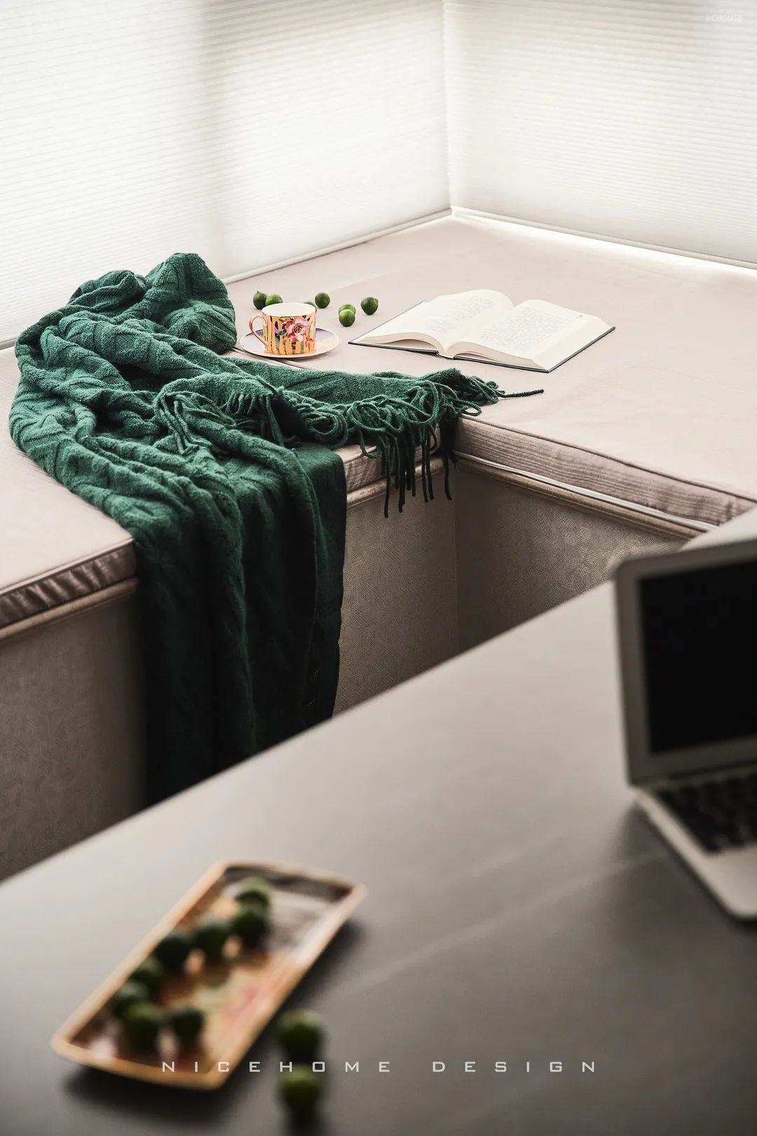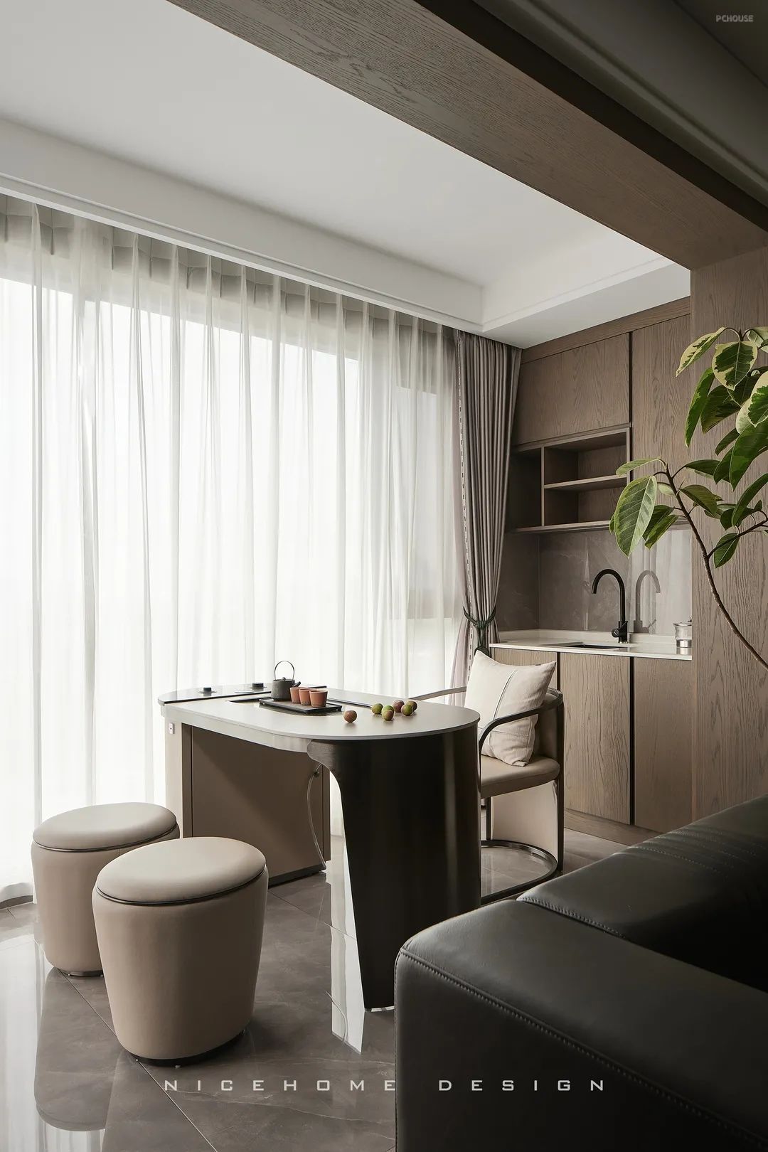 阳台处设计品茶区,清冽的茶香伴着温煦日光,萦绕此间的只有言笑晏晏的自在感受。