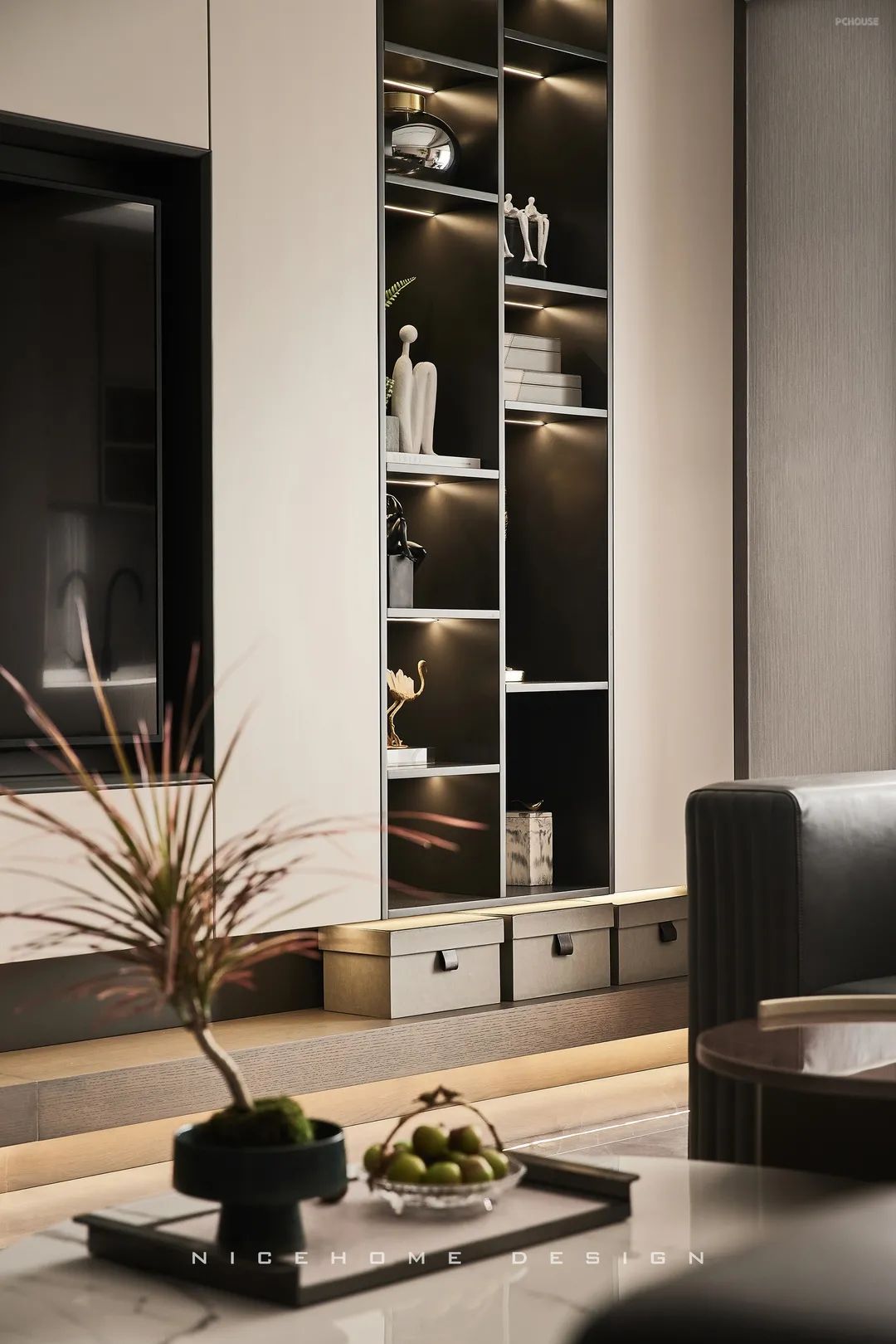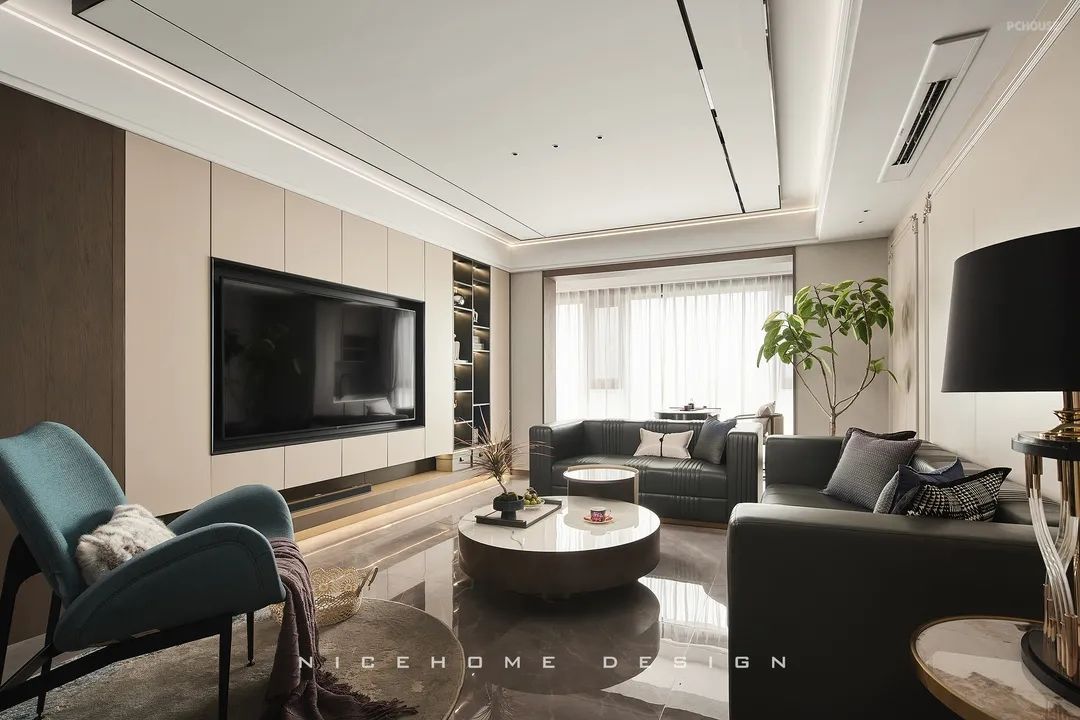 壁挂电视与收纳背景合而为一,外观利落整洁。储物柜精准分配开闭比例,收放自如之间,稳妥了实用机能,协调了日常节奏,让设计感恰到好处。