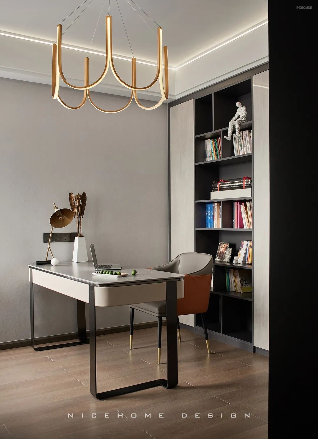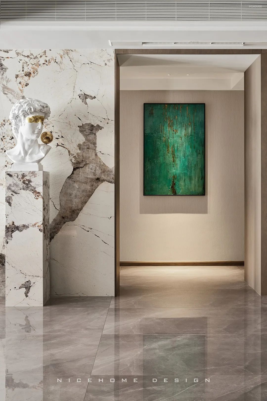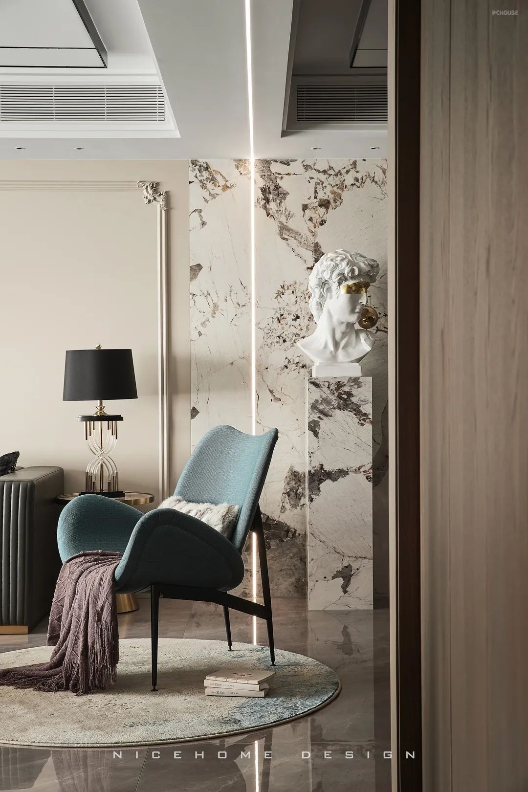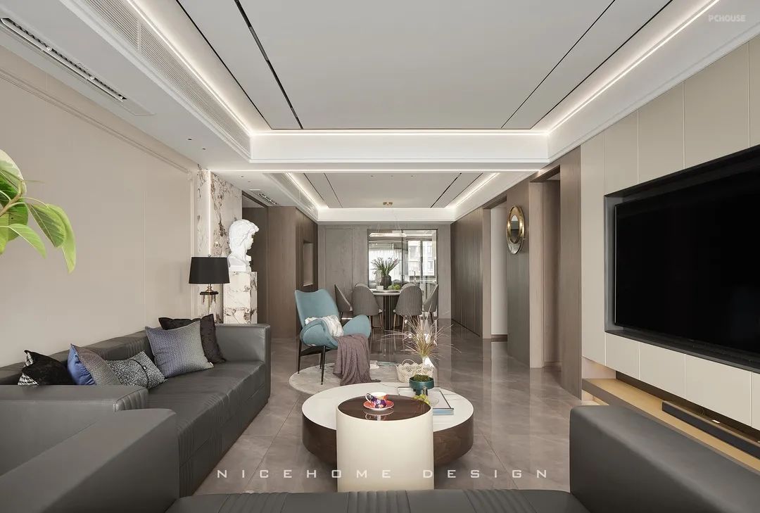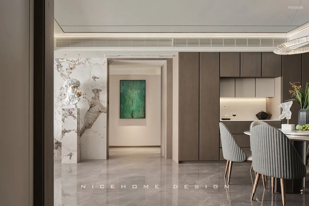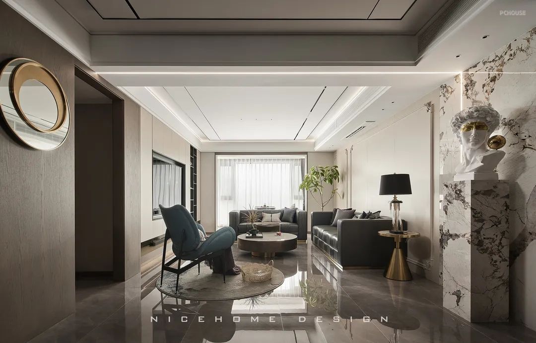 顶面黑色不锈钢和磁吸轨道灯形成线条延伸感,增加了视觉层次。沙发背景植入小法式护墙混搭,与大卫雕塑组合,为空间注入灵动与格调。自过道口顶端特意拉出一道折线灯带,勾勒个性的艺术气场。