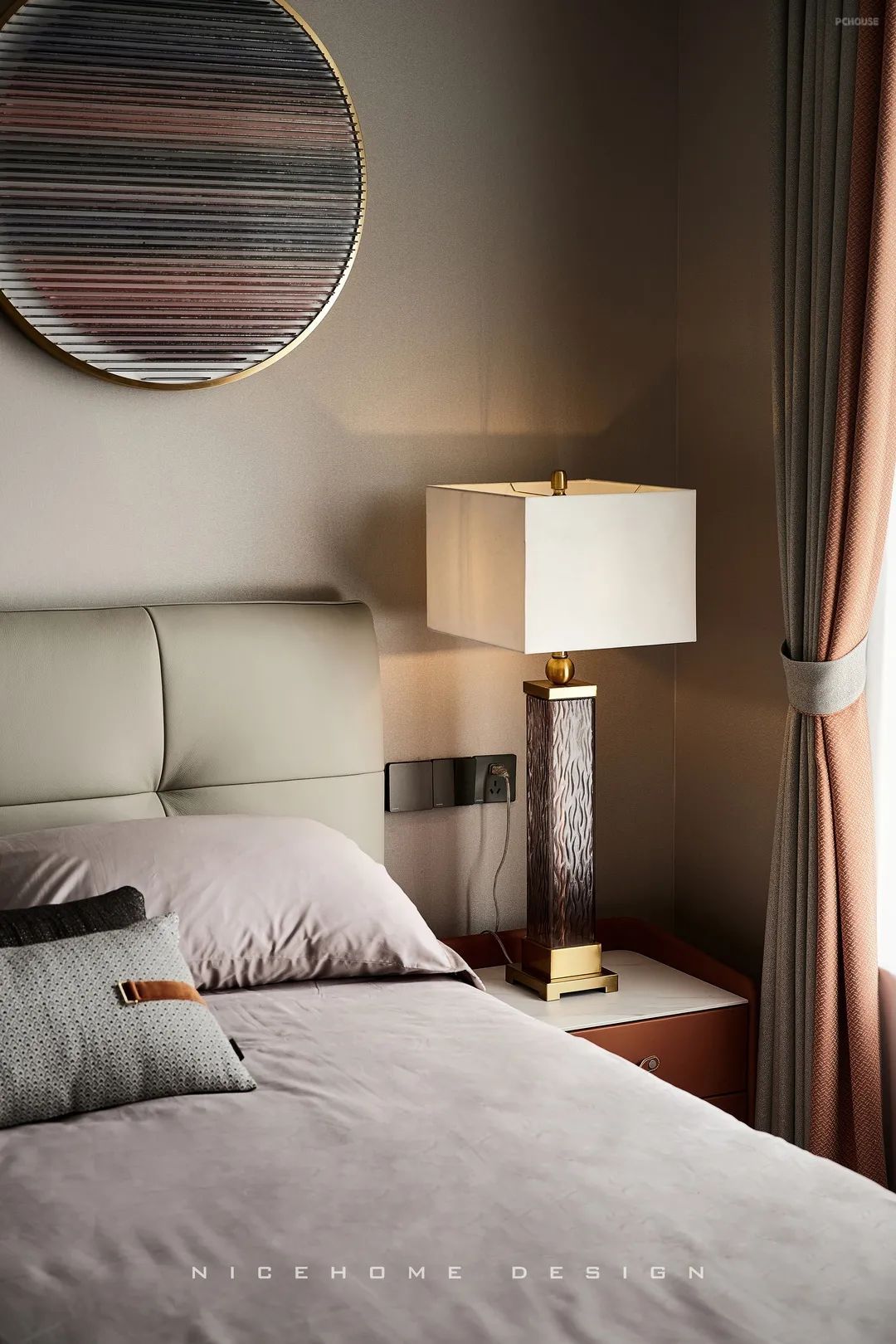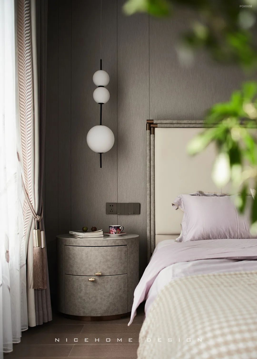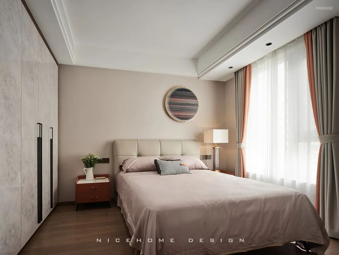 客卧的气质同样雅致非凡,光线流连入内,盈盈散发着温润平静的质感。右上角的个性挂饰就像是悬浮在半空中的月亮,让夜晚充满浪漫的情调。