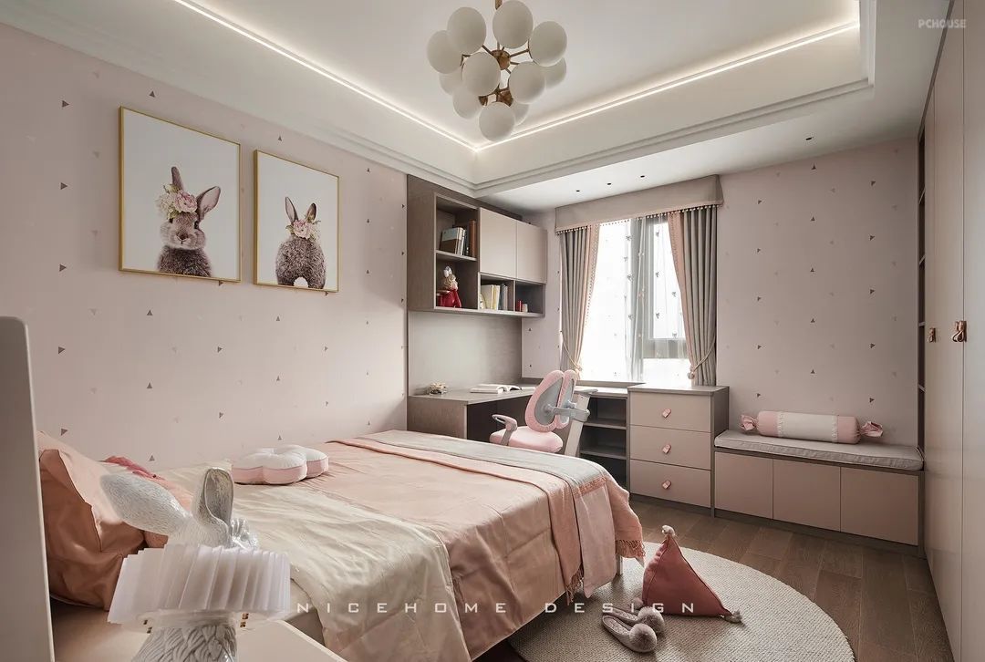 以马卡龙粉为主色调的女儿房,睡眠区、学习区、休闲区、收纳区被有序安置,保障孩子能够拥有一个完善的成长环境。房间内也有许多孩子喜爱的童趣元素,看,墙上这只头戴小花的兔兔是不是就特别地可爱呢~