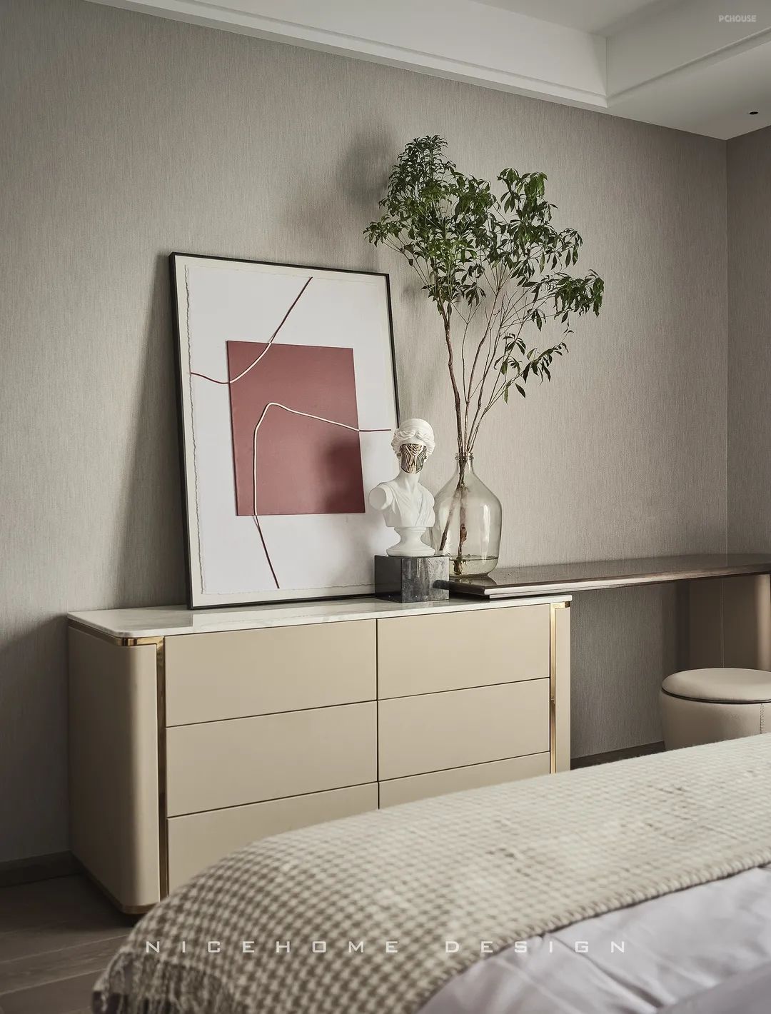 床尾斗柜延伸出梳妆台区域,绿植、画作、小雕塑,共同围构出一角小小的艺术天地。