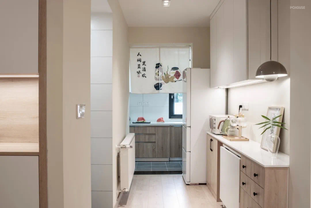 厨房选用原木色搭配白色墙砖,简洁大方,显得空间大!