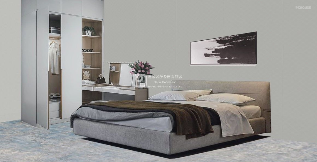 次卧设计硬装部分非常简洁,乳胶漆墙面搭配棕色绒面床体和深色床品,设计效果精致,独享最大的舒适度。深色的恰当利用,提升了家里整体的艺术气质。定制的衣柜+梳妆台组合设计,只占一个小边角,高与低,错落有致,简洁淡雅的搭配,装饰效果很强,高效地利用了空间,让空间更具统一整体,让人印象深刻。