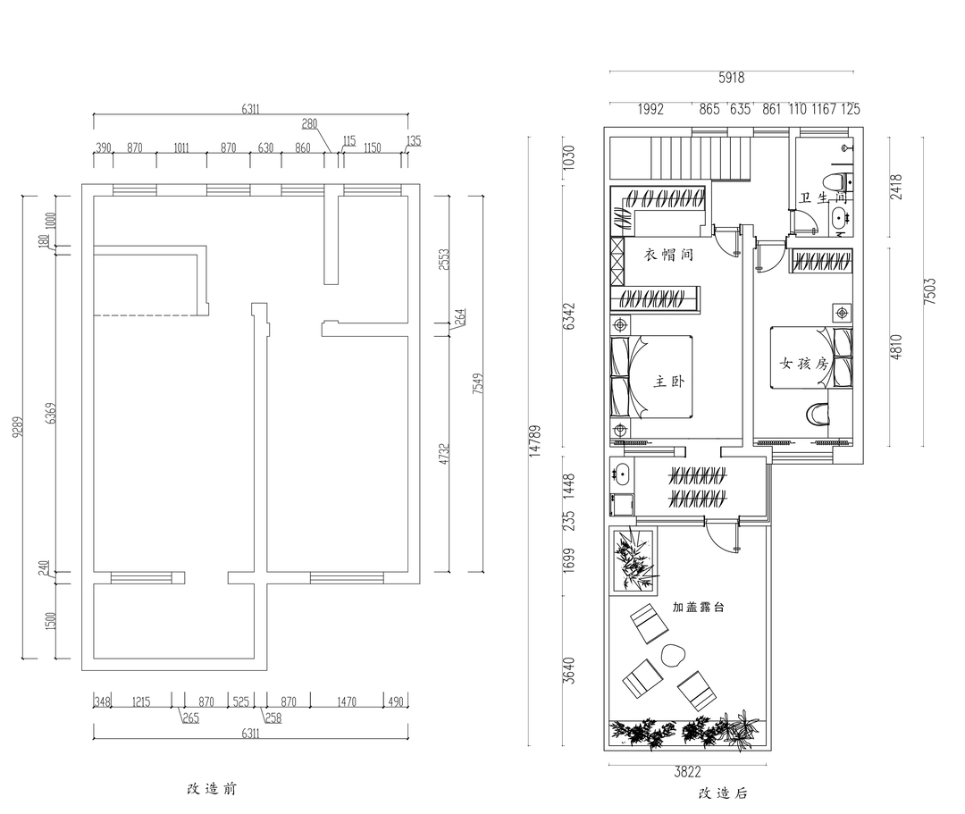 2. 加盖处作为新的休闲露台,可以满足女主人喜欢在庭院中种植花草和植物的需求,也使我们的主卧空间可以与庭院中的绿植相互借景呼应,再一次的扩展卧室的空间视线