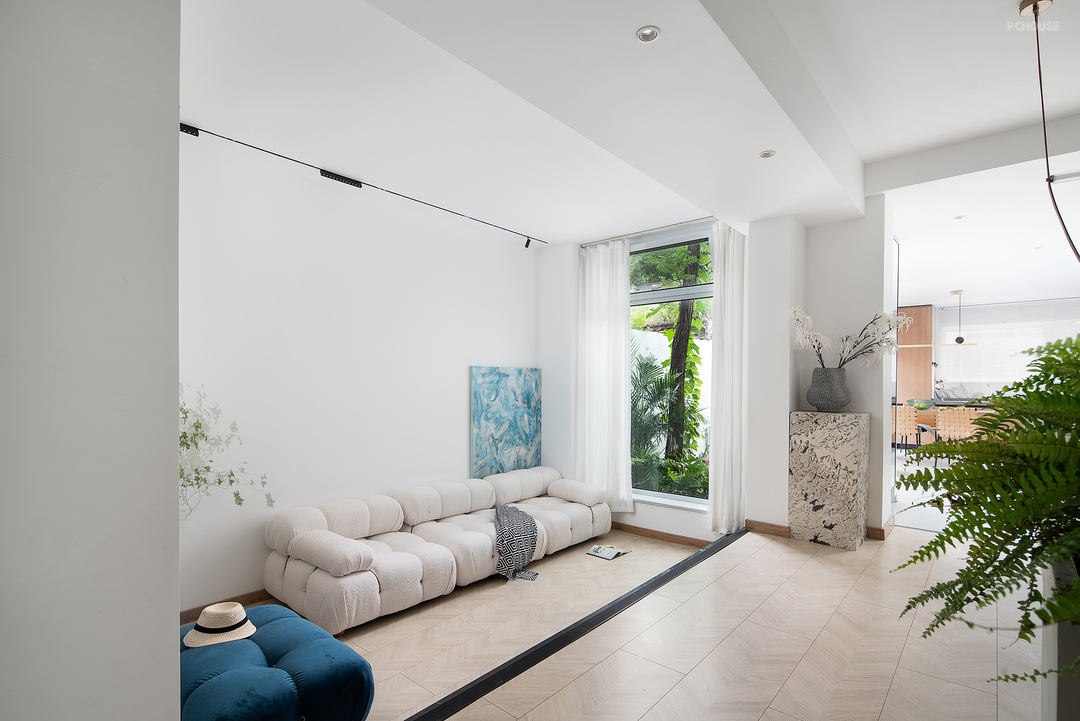 在新客厅区域做了下沉式处理,保留视觉开阔的同时无形中为空间做好功能规划,同时也使我们常坐空间与室外小景更加贴近