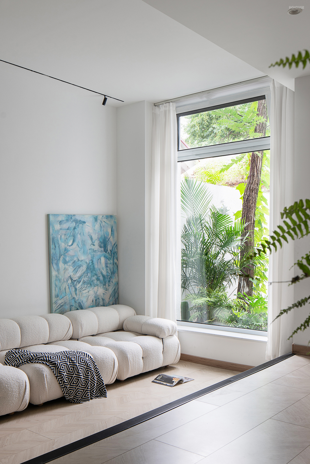 不浪费基地难得可贵的优势-自然光,设计师打通空间隔阂,一整面的开窗,让光得以尽情地撒落。白日里,甚至无须人造灯的点缀,点亮纯净空间的推手是阳光的温暖,温暖了满屋的情感。