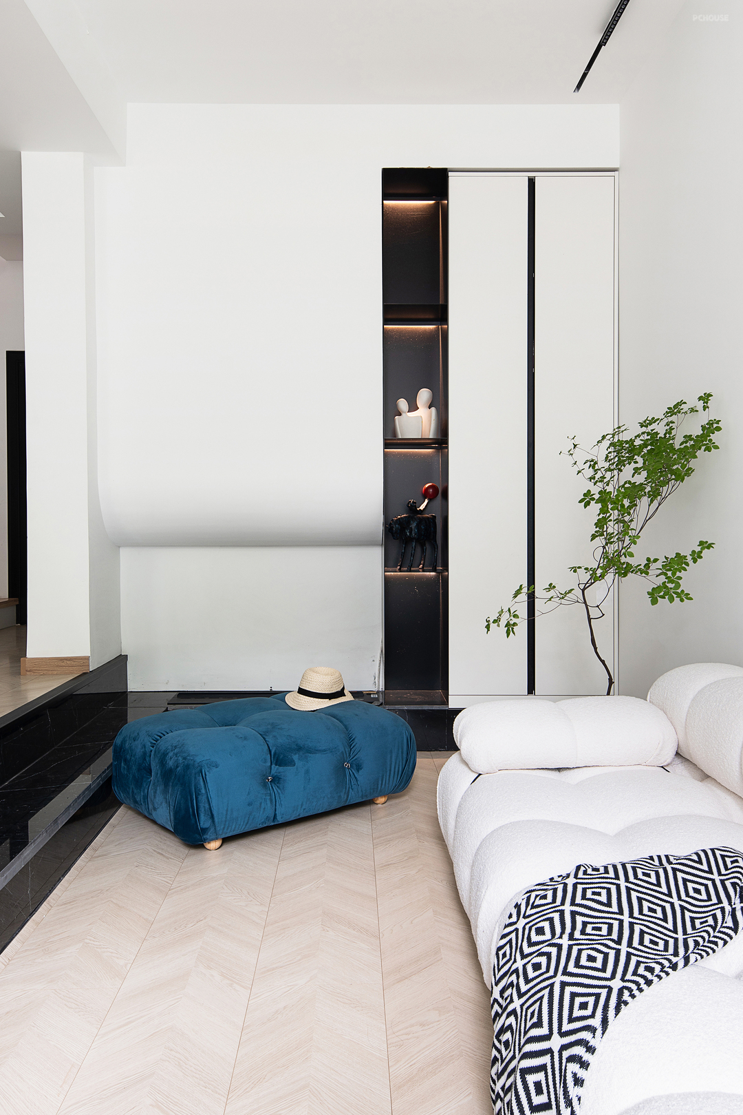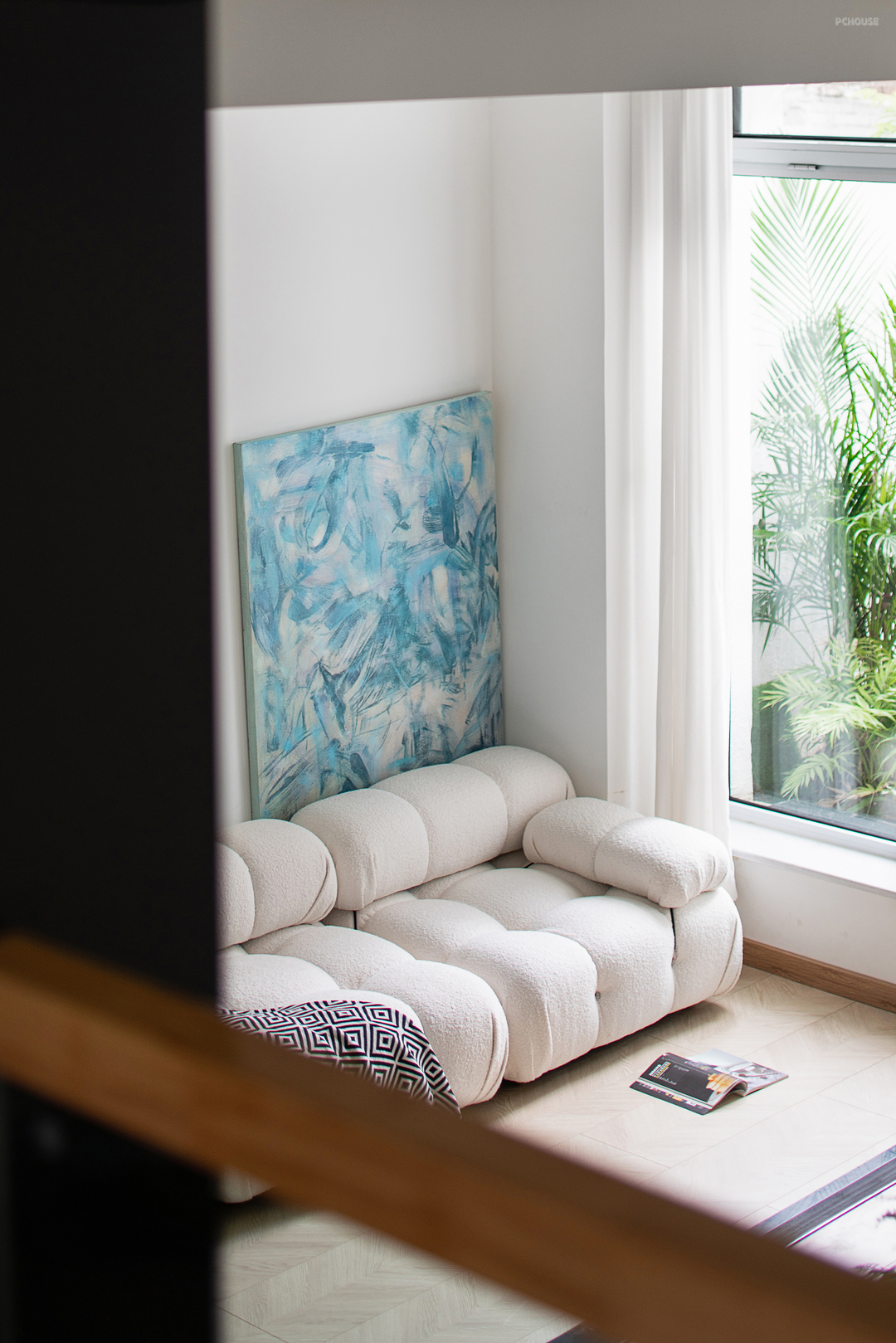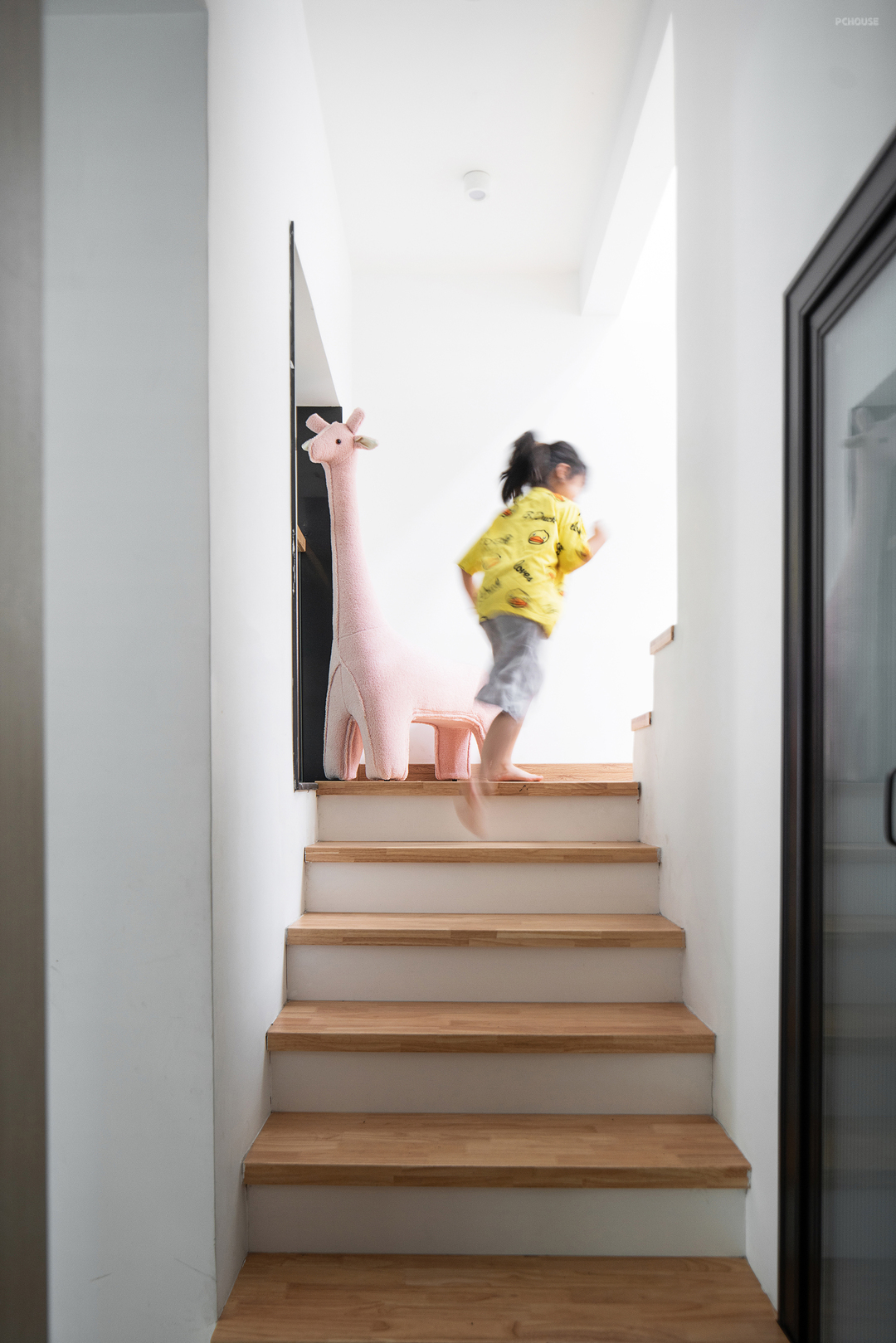 楼梯与客厅共墙的局部拆除,让本就狭小的空间得到了难得的延展释放,纯白与原木的搭配让空间更加简洁自然