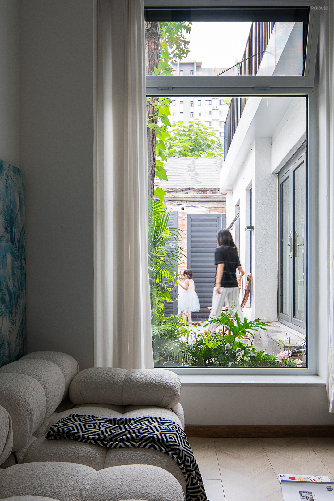 院子里保留的老树与新做落地窗形成的光影让空间产生不同的动态景观,也可以让孩子在空间中感受时间与生命的美好
