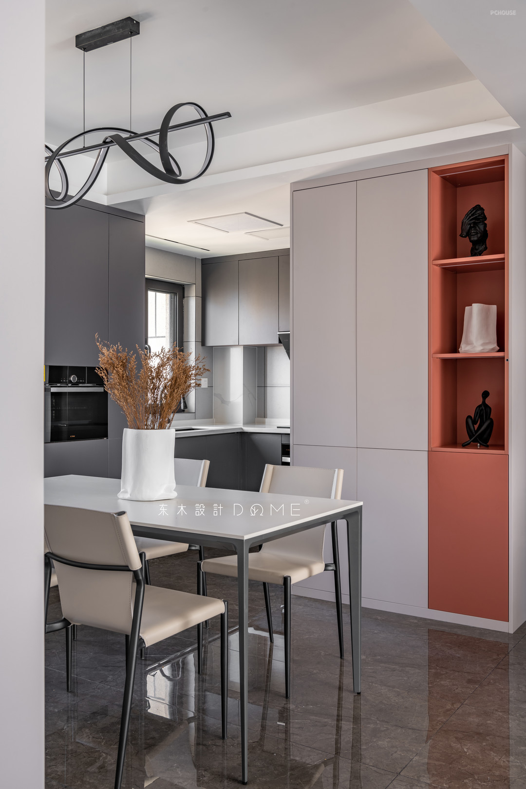 前言: 空间以灰色系为主,深灰色橱柜,黑色艺术吊灯,洋溢出主人的个性,局部的细节软装搭配,又彰显文艺浪漫主义情怀。