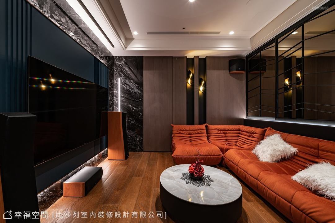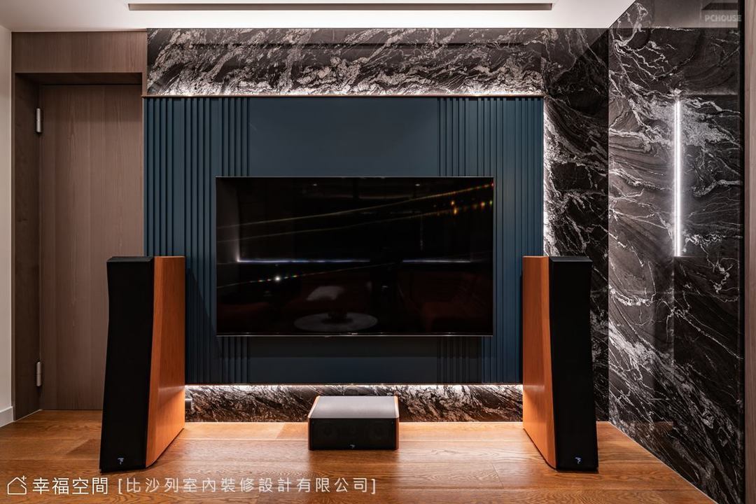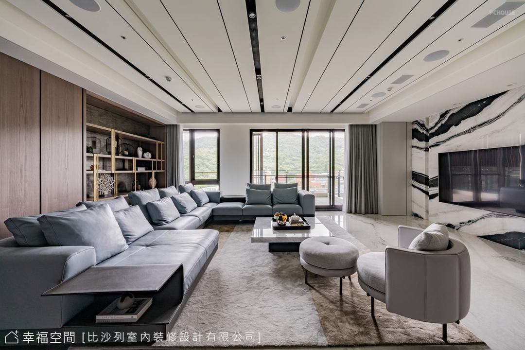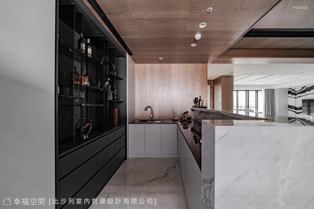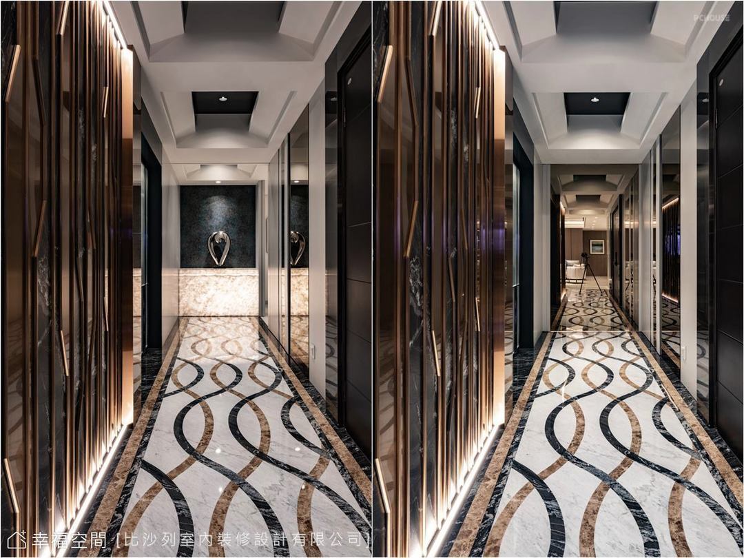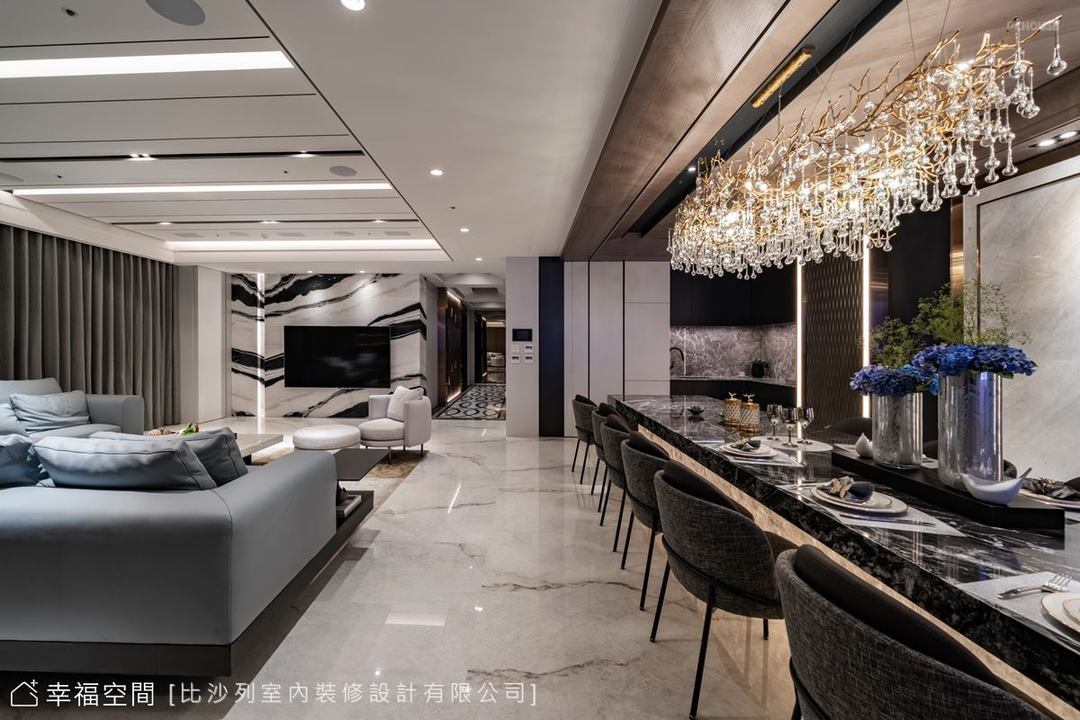 由于是两户打通,因此设计师将两个门改为一道双开门,揭开恢弘序幕。步入室内,迎面而来的是石材与不规则镀钛线条搭接而成的华美端景,地坪亦刻划着水刀切割的波浪纹,传递动态美感。公领域相互连通,仅借由家具、天花设计界定场域,呈现轩敞无压视野。客厅电视墙选用熊猫白大理石,其肌理线条之间距宽阔,能放大视感,铺垫豪邸的气派感。而天花亦延续电视墙配色,以黑色为底辅以白色片状结构,形塑悬浮般的视觉效果。沙发背墙改以温暖木质铺陈,但仍结合金属质材,点染微奢气息。