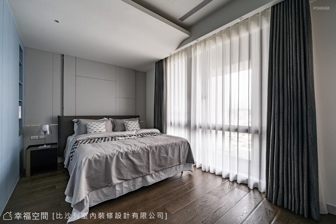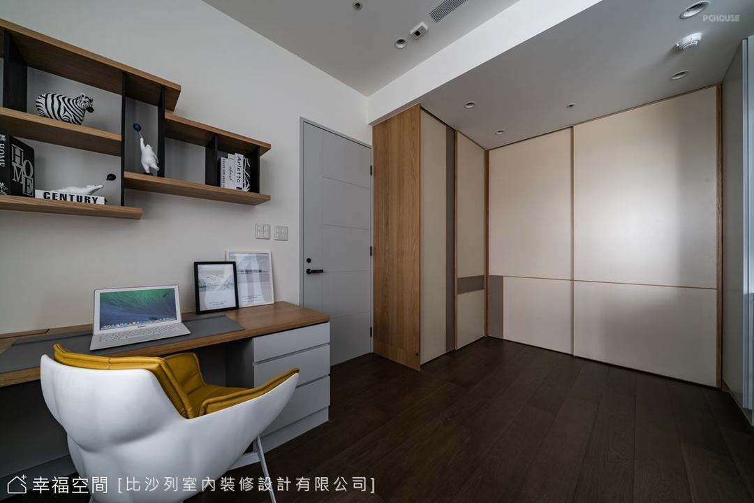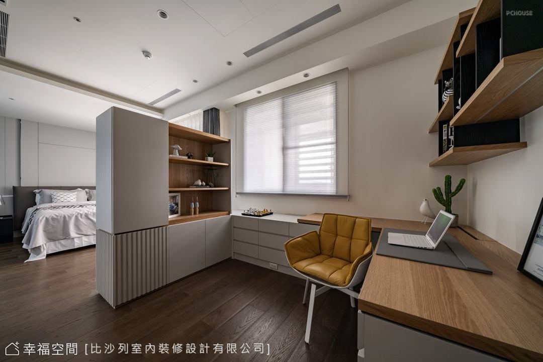 餐厅精心订制长度达五米的中岛桌,满足宴客需求。木质天花则揉入斜面与黑沟设计,形构不对称美感,搭配璀璨水晶灯,扩散低调但不过于张扬的华丽因子。书房分为阅读区与多功能区,中央以拉门与短墙面区隔,划出回字动线。阅读区置入充足收纳,书桌以薄板砖做出宛若天然石材的质感,展现巧夺天工的精湛工艺。主卧坪数宽敞,故配置了床区、双衣帽间与卫浴完备机能。