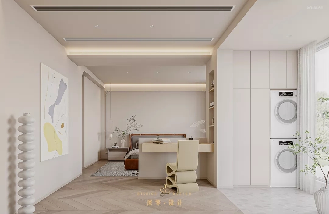 ②二层为主卧套间,调整空间配比,增设衣帽间及办公区,放大生活细节。