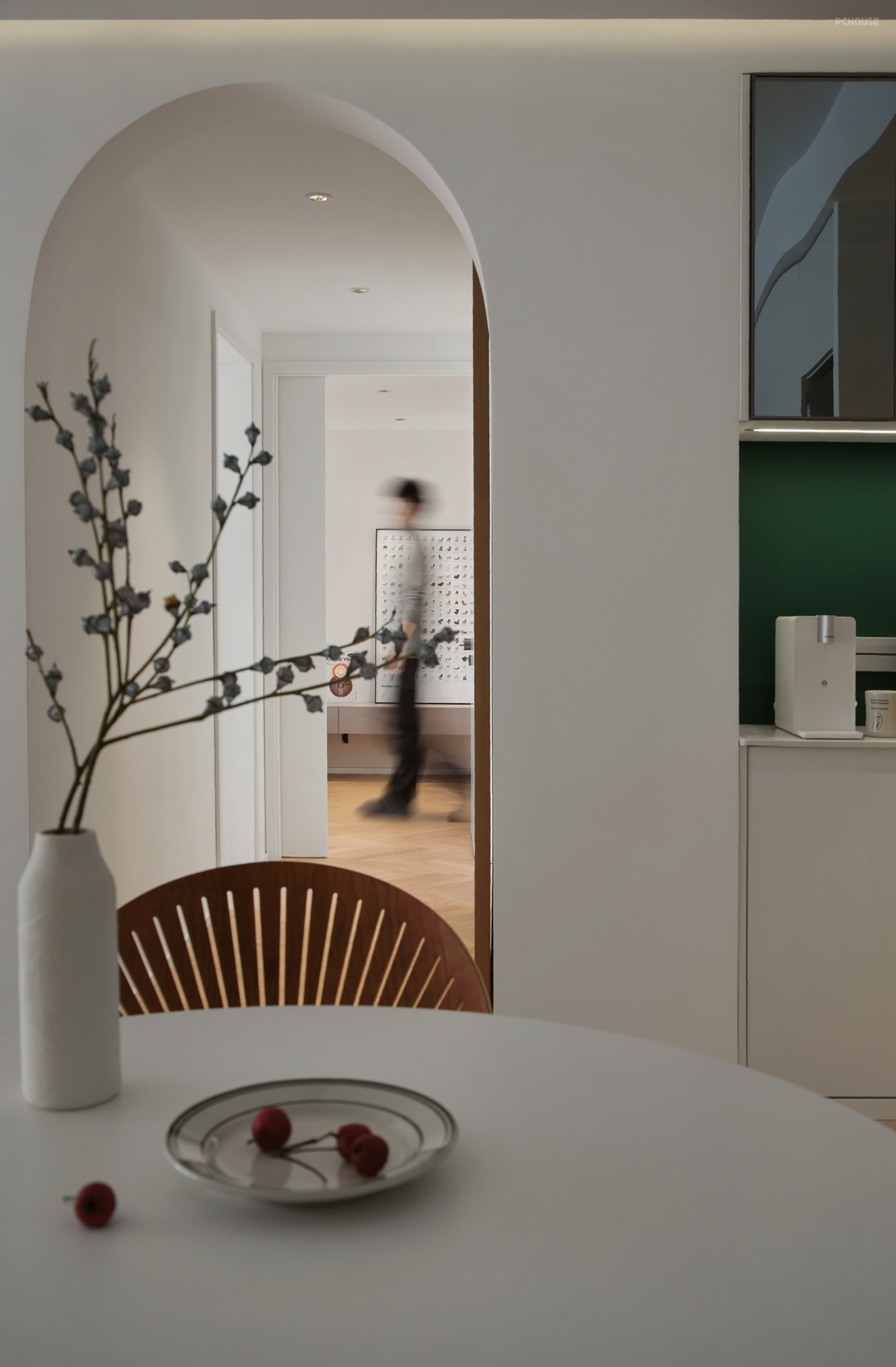 通往睡眠区的过道,是空间动静对峙的临界,采用了弧形的门洞设计呼应了客厅的弧形造型顶,让单调的纯色立面变得柔和温暖。