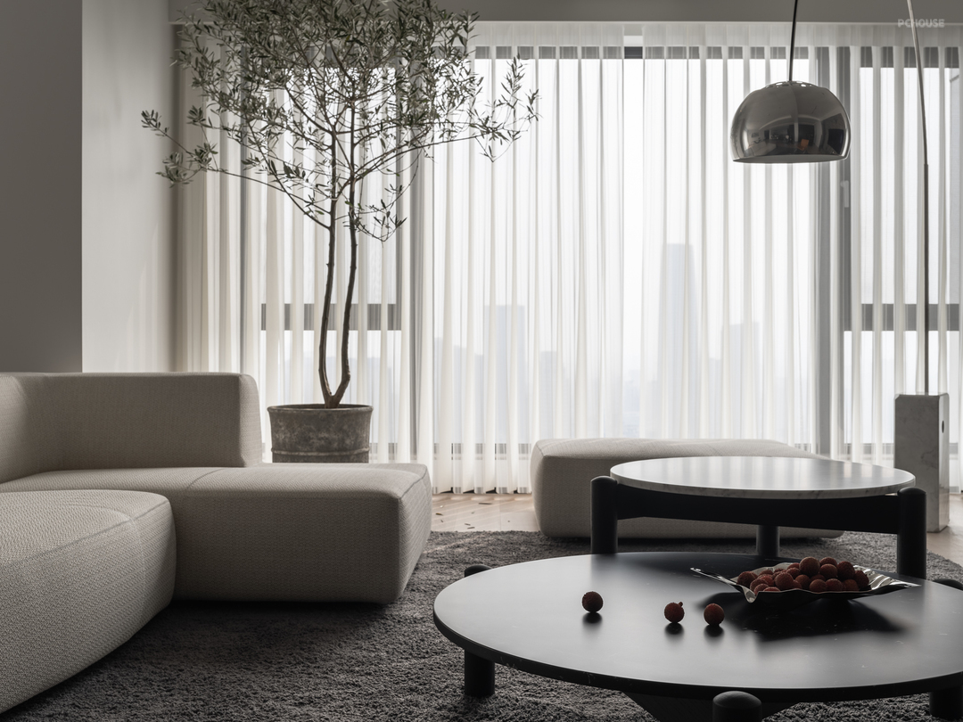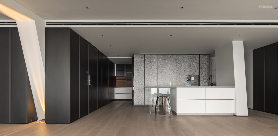 走进客厅,视线随即被梁与柱间的呼应关系所吸引,斜向的墙面将梁撑起,又成为柜体相隔的转折。极致的线条在纯粹的白中寻找空间秩序,以非对称的形态探索另一种可能,为黑白灰所营造的克制氛围中,注入了一份自由感
