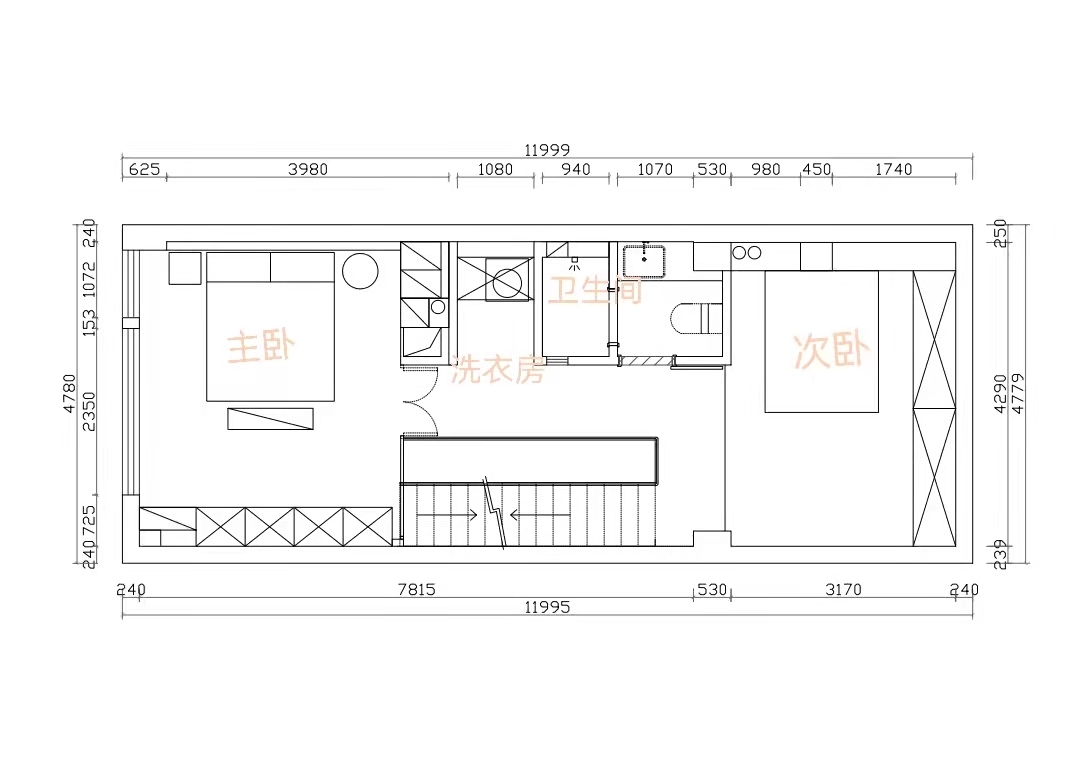 改造后基本在家看不到裸露的水管和梁体,还有承重柱。厨房用烟道和水管的位置像客厅借了点光,二楼的砌墙的位置都是根据承重柱展开的,主卧的水管,烟道都藏在了柜子里面。二楼卫生间主下水排口需要非常注意,需要在楼底下一楼接主下水管,现浇楼板主下水管的位置不能有钢筋和梁体。二楼在主卧和次卧之间增加了洗手间和洗衣房,这样使用起来更加的方便。