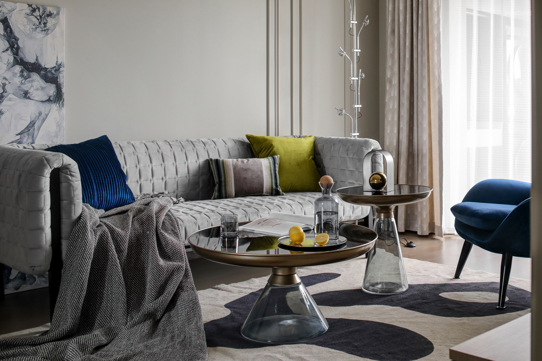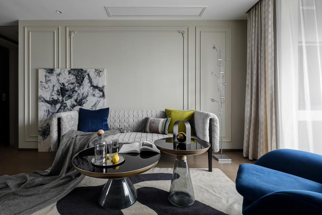 客厅中间布置了一款组合茶几,由51cm*51cm+81cm*41cm的两个玻璃茶几组成;圆是非常具有美感的图形,两个圆形茶几的搭配,一轻一重,高低错落,让整个空间的平衡性达到了最优化。