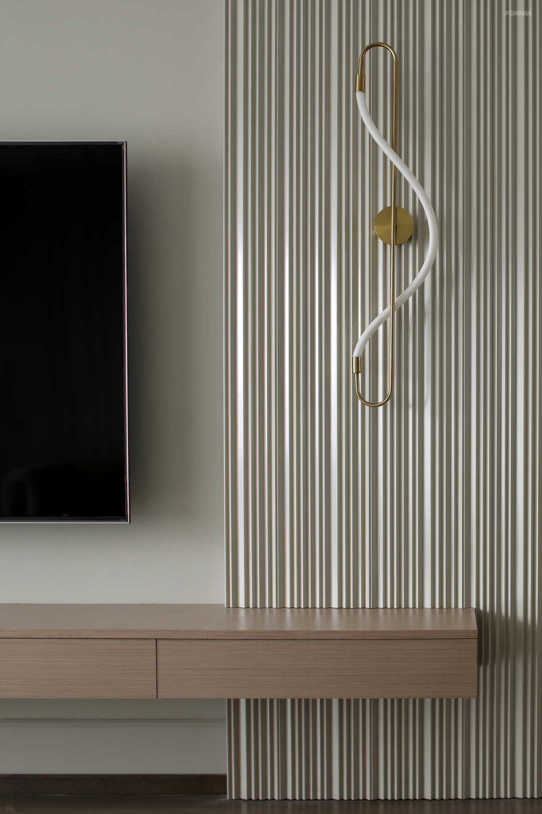 电视背景墙整体造型简化,电视柜底部腾空,就像是悬空的一样,木色的电视柜只占据电视下方一小块空间,在一片简约素净中,营造出一份温暖舒适。背景墙一角点缀奶油灰的格栅,与整体色调统一,将线性元素带入到空间中,让墙面更具层次感和艺术感。在其中安装一款音符造型的壁灯,温婉而轻盈,赋予空间别致的格调。