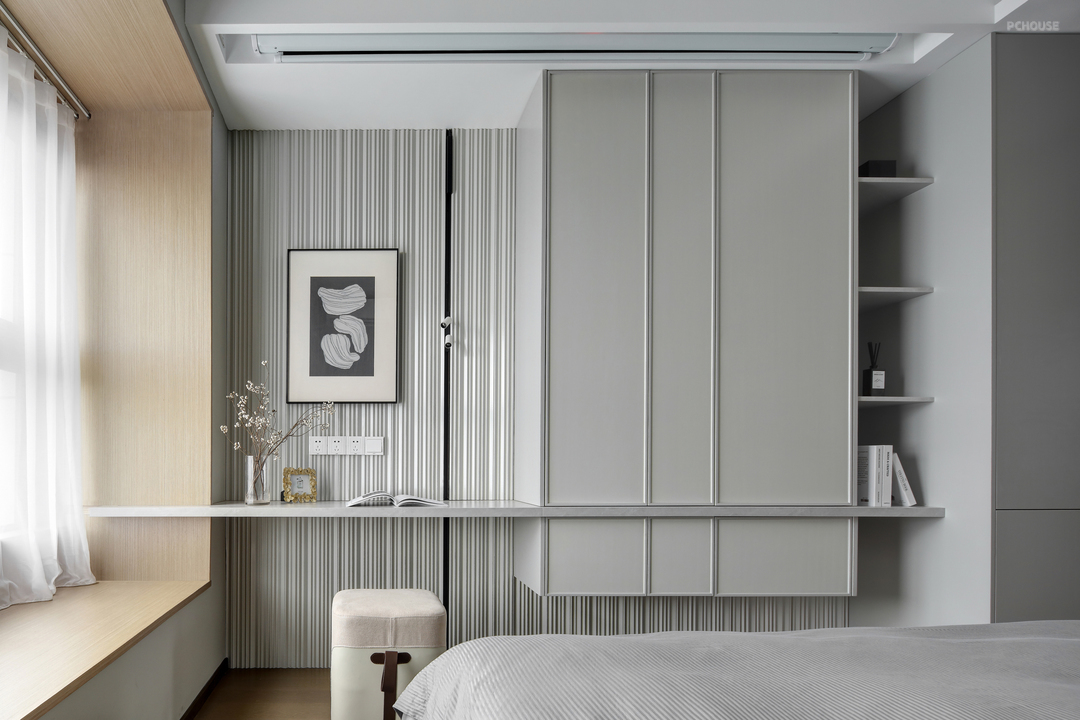 通过电视柜的搁板延伸,打造了悬挑的梳妆台空间,也可作为临时的办公使用,整体优雅而轻盈。背景墙采用冷灰色的格栅装饰,与整体色调统一,在其中嵌入轨道壁灯,可以灵活调整位置,整体带来简约的线条美感。在其中融入一幅抽象挂画,为空间平添一份艺术气息。