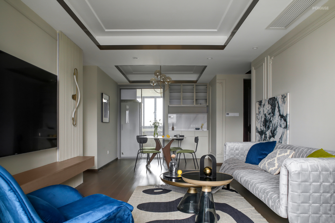 客厅采用奶油灰色与木色的主色调,将阳台移门拆除打通后,阳光透过窗户照射进屋内,带来朦胧的美感,自然又有诗意。那一抹宝蓝色,在温润的空间中展现出一份冷静温婉,作为一款单人沙发,更是集合清新柔情特质于一身,感受舒适惬意的享受。