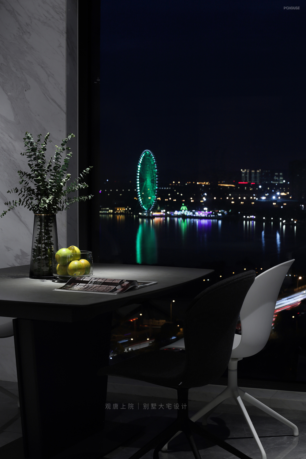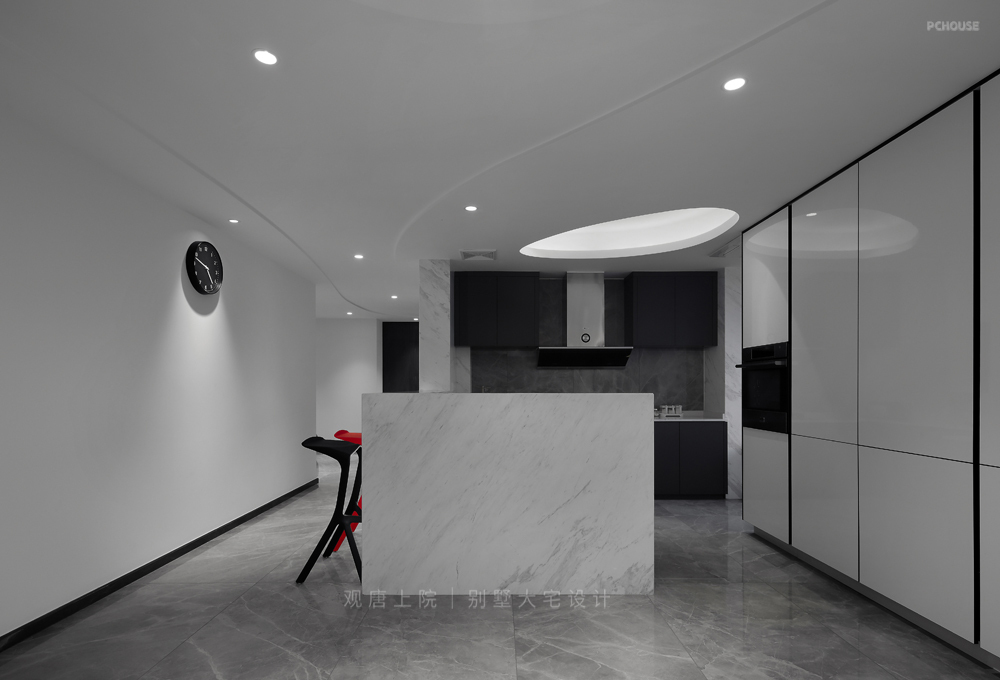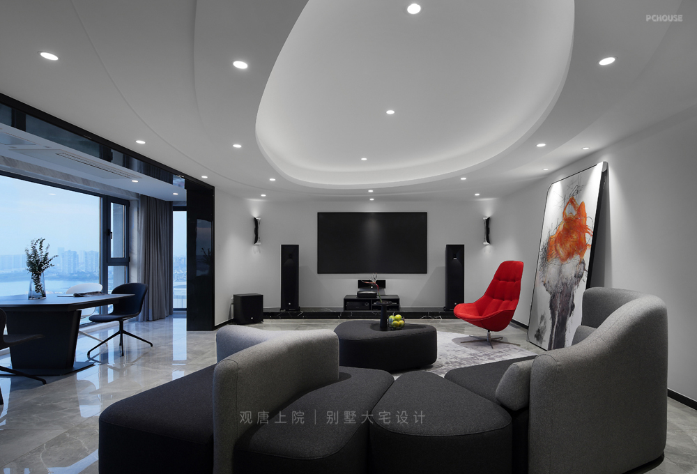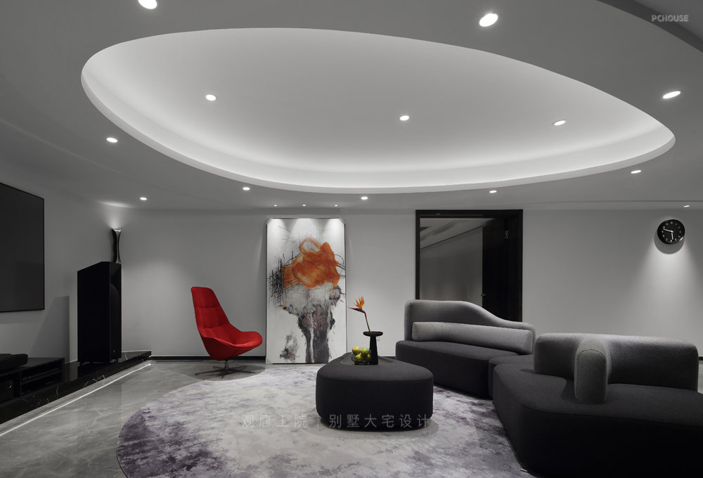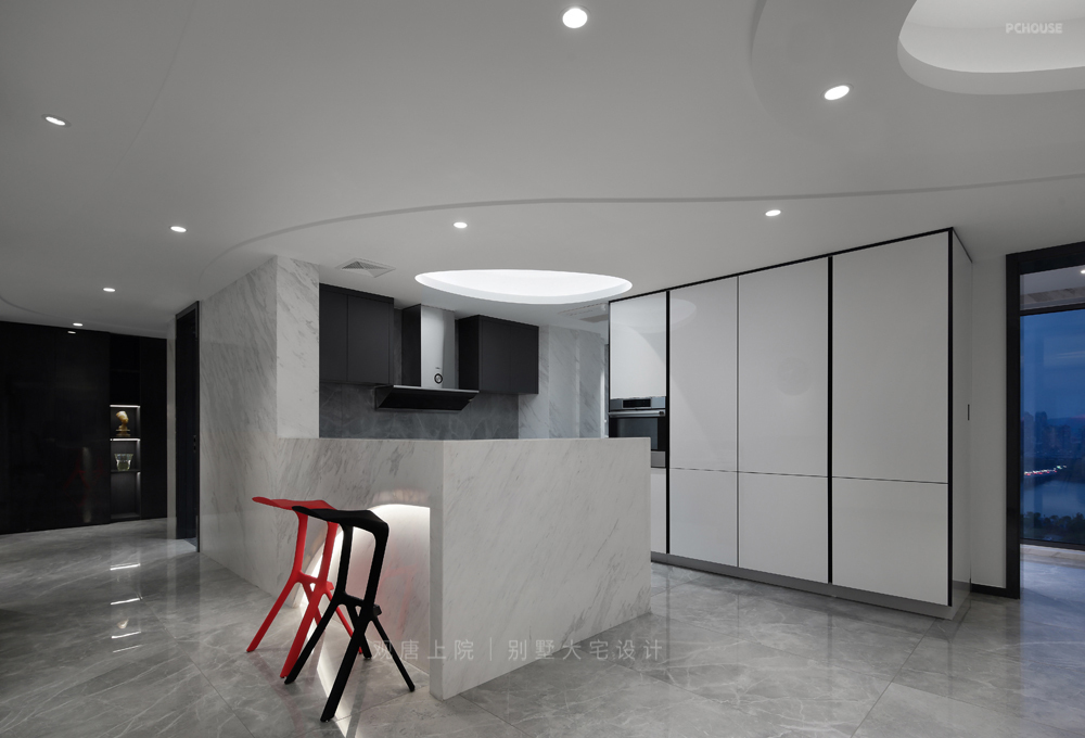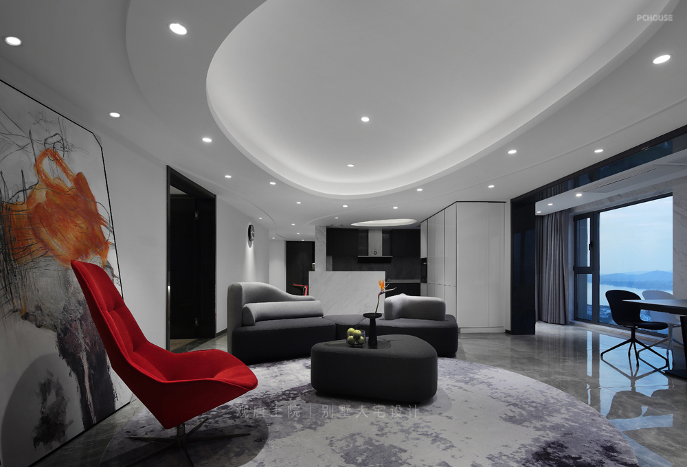 以黑、白为主色调,创新性地加入了少量红色、橙色,给整个空间带来了充满活力的现代感。弧形墙面、顶面流畅的曲线线条,都处于不规则状态,不仅灵动飘逸、浪漫轻盈,与室外的风景交相呼应,而且对施工的工艺要求极高。