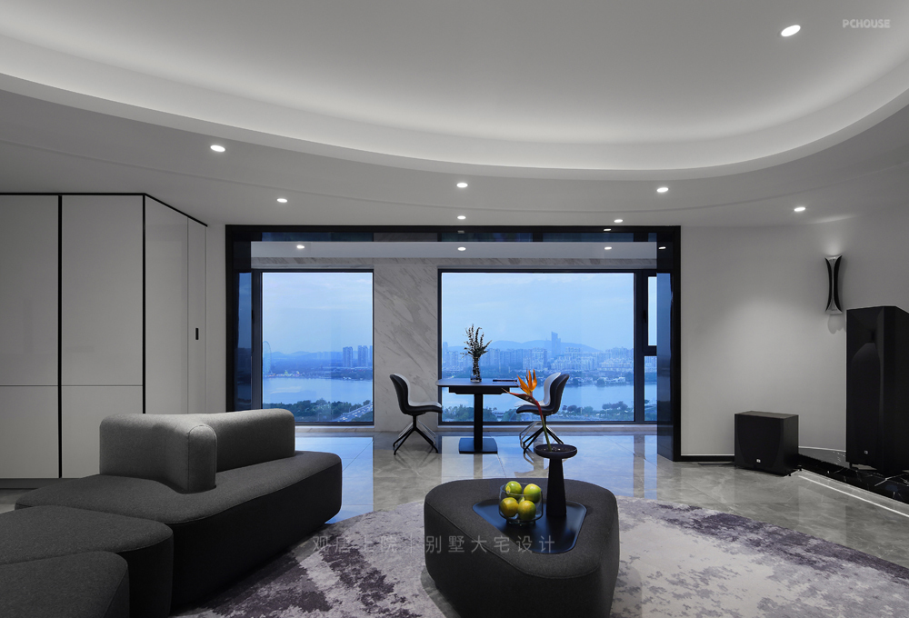 客厅的沙发三面不规则形状,可随意的调整为任一角度,在休闲之余,又将窗外蠡湖的风景、伴侣的笑容尽收眼底。