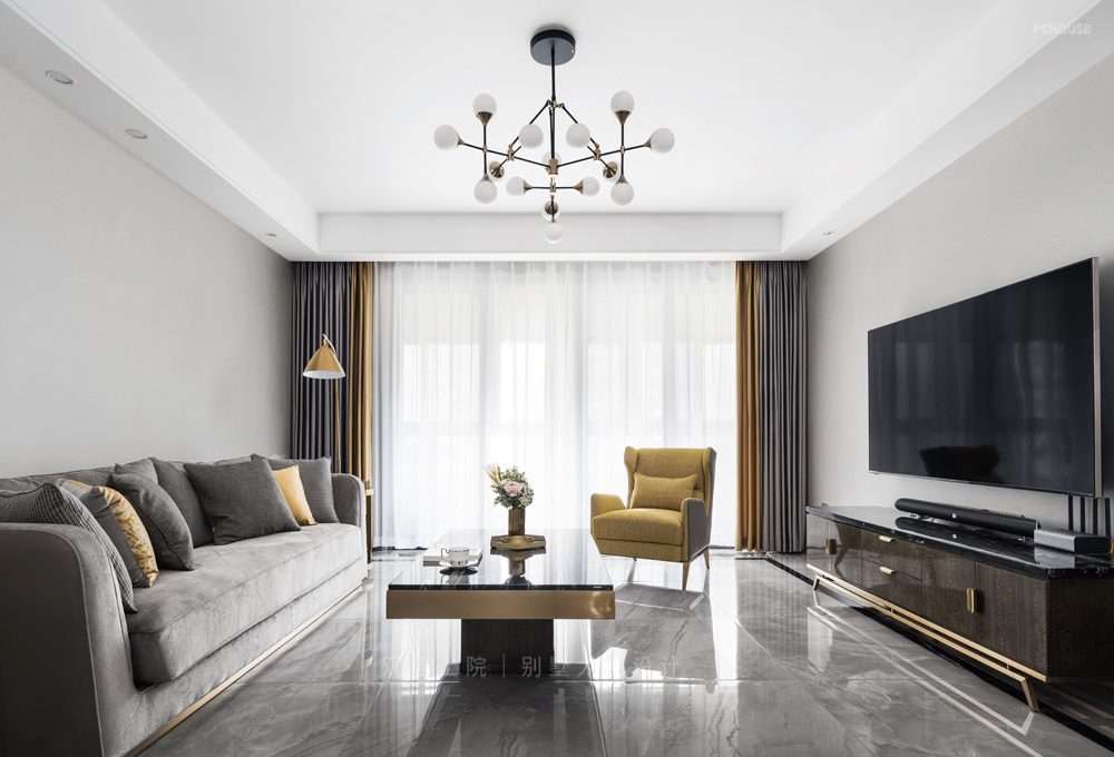 客厅空间以灰色和金色作为主基调,与光感呼应,古堡灰大理石,色彩跳跃的装饰画,金属线条饰品等的点缀,给空间带来视觉上的充盈感,给予客厅无限的低调奢华、舒适与精致。