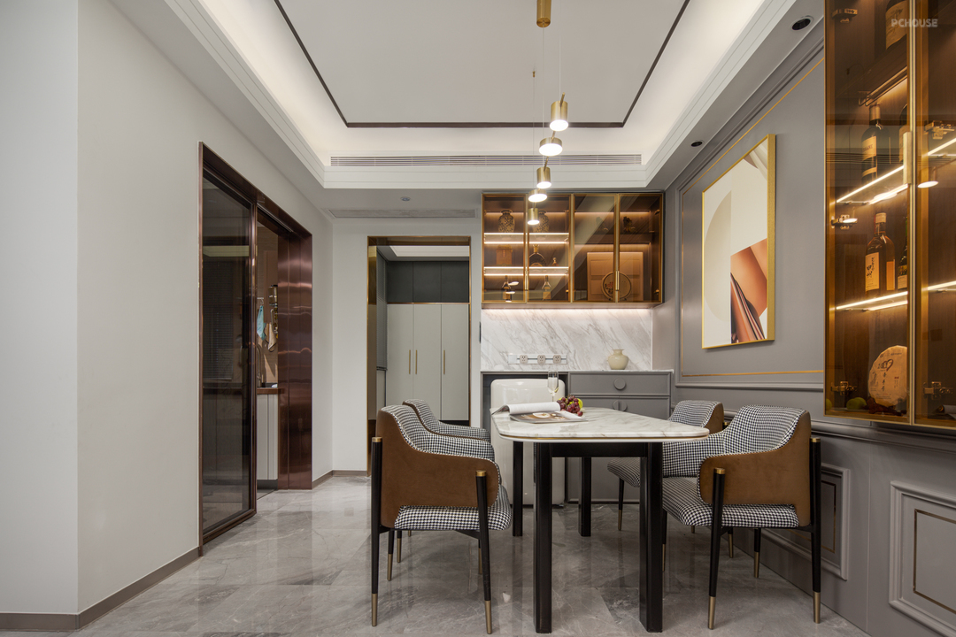 客户每日有饮酒品茗的习惯,所以在餐厅周边分别了设计了餐边柜以及酒柜。餐边柜主要方便日常收纳。操作台下方设有迷你小冰箱,便于客户对茶叶的收纳、保鲜。酒柜设计为玻璃柜门,使空间通透性更强,配合氛围灯带增加了展示效果。