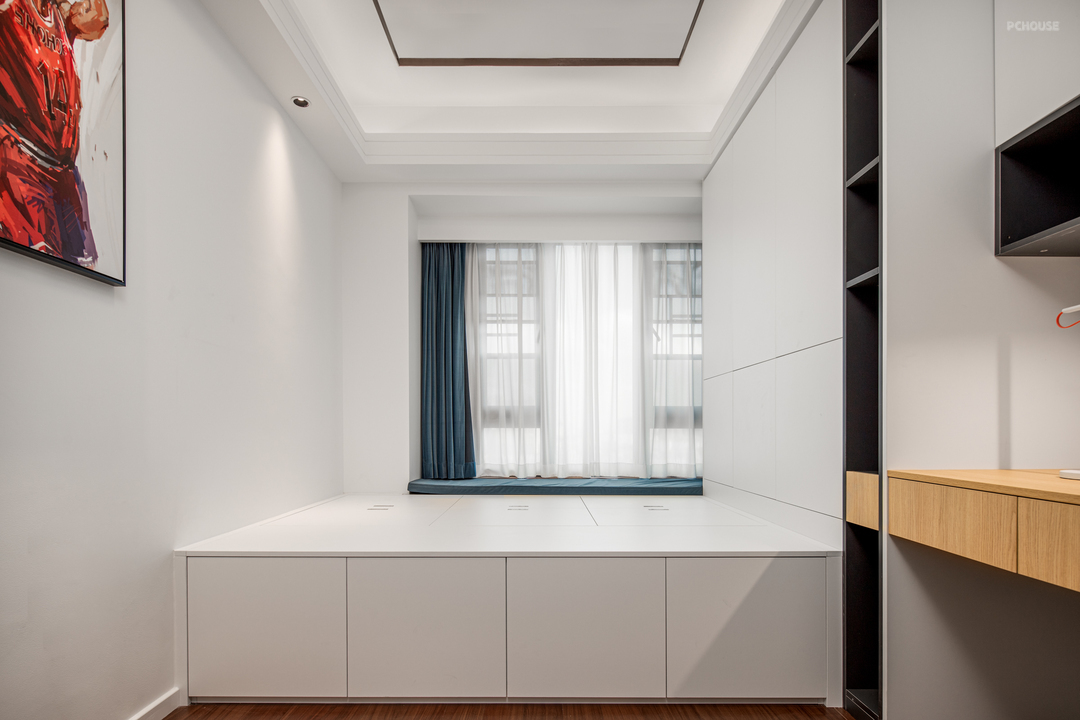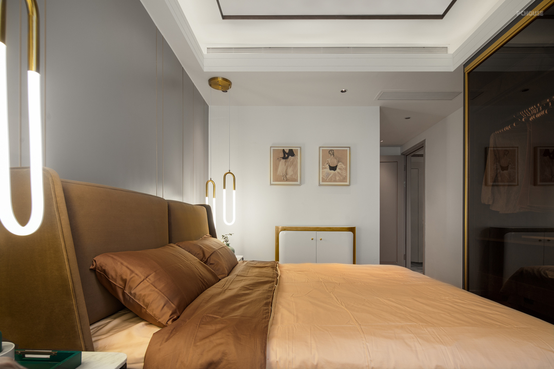 主卧设计在原有格局上,把侧边的衣柜调整到床尾的位置,有效释放了两边通道,使两边下床动线变得宽敞、舒适,在原有衣柜的位置增加了薄边柜,方便日常用品的收纳,及艺术展示。