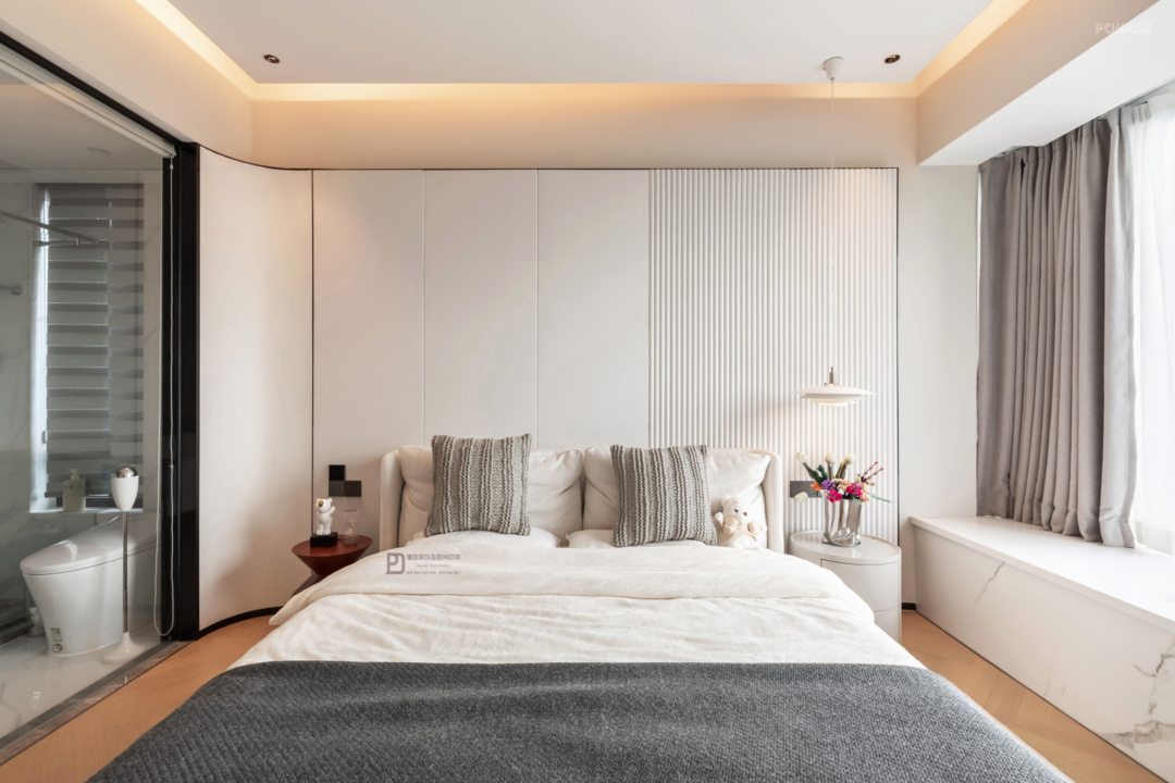 白色与浅灰色作主要配色的空间,深浅色系之间衔接自如,增添视觉层次。装饰花艺的点缀,展现了现代极简主义下的生活美学,暖色的床头灯为空间带来无限的温暖。 飘窗使用大理石装饰面,给空间带来轻奢的同时又保持了温馨的调性。