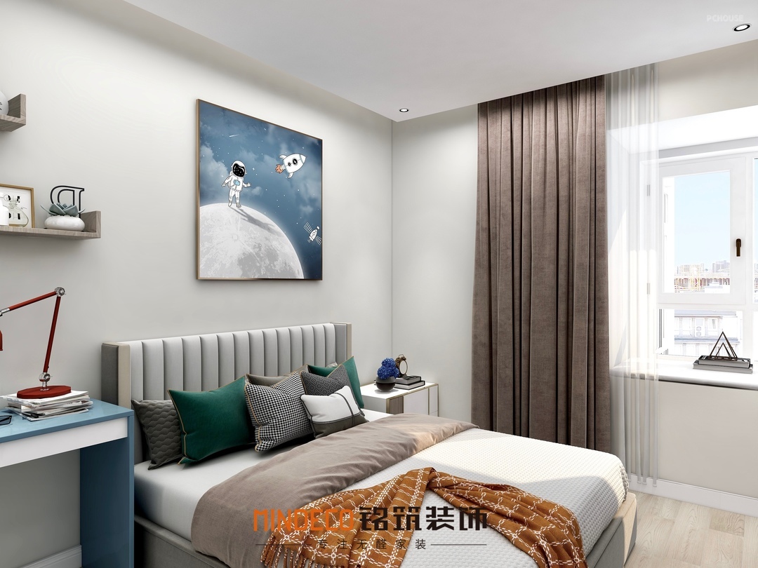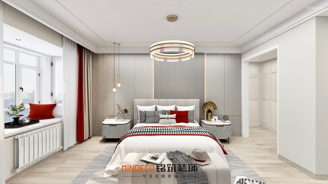 卧室床头墙是灰色的硬包背景墙,布置同色系的皮艺床,与摆设床单,地上铺设暖灰色几何图案的地毯,床上也加入一席红色,灰色+红色拼色的窗帘,整体空间也是显得更加活力而时尚大气。主卧区域采用了组合式背景墙,床头的小吊灯打破传统台灯形式,让生活更为便捷。