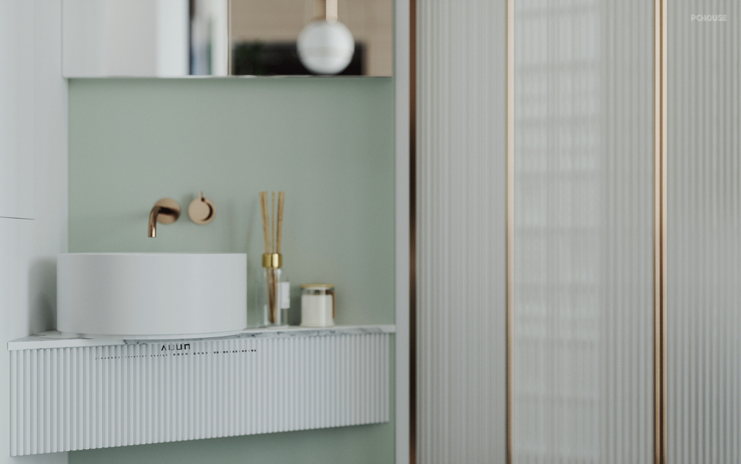金色暗装水龙头比普通水龙头精致小巧,配合水池旁的金边香薰瓶、金边漱口杯,金色门框、金色隔断呼应轻奢风。